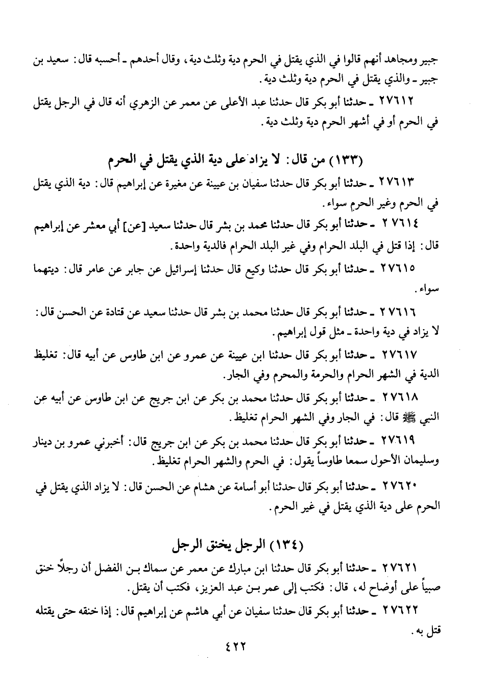 27616 - حَدَّثَنَا أَبُو بَكْرٍ قَالَ: حَدَّثَنَا مُحَمَّدُ بْنُ بِشْرٍ قَالَ: حَدَّثَنَا سَعِيدٌ، عَنْ قَتَادَةَ، عَنِ الْحَسَنِ، قَالَ: «§لَا يُزَادُ فِي دِيَةٍ وَاحِدَةٍ مِثْلَ قَوْلِ إِبْرَاهِيمَ»