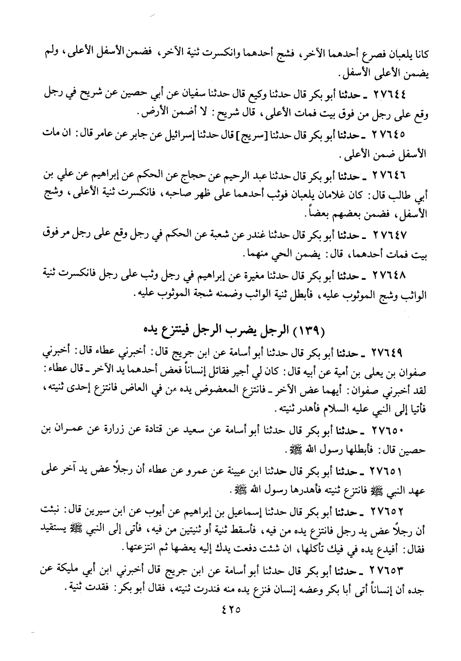 27652 - حَدَّثَنَا أَبُو بَكْرٍ قَالَ: حَدَّثَنَا إِسْمَاعِيلُ بْنُ إِبْرَاهِيمَ، عَنْ أَيُّوبَ، عَنِ ابْنِ سِيرِينَ، قَالَ: " نُبِّئْتُ أَنَّ رَجُلًا عَضَّ يَدَ رَجُلٍ، فَانْتَزَعَ يَدَهُ مِنْ فِيهِ، فَأَسْقَطَ ثَنِيَّةً أَوْ ثَنِيَّتَيْنِ مِنْ فِيهِ، فَأَتَى إِلَى النَّبِيِّ صَلَّى اللهُ عَلَيْهِ وَسَلَّمَ يَسْتَقِيدُ، فَقَالَ: «§أَفَيَدَعُ يَدَهُ فِي فِيكَ تَأْكُلُهَا، إِنْ شِئْتَ دَفَعْتُ يَدَكَ إِلَيْهِ يَعَضُّهَا، ثُمَّ انْتَزَعْتُهَا»