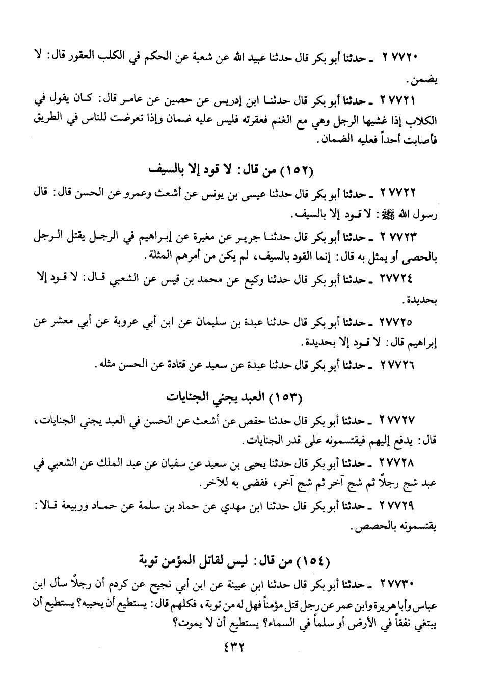 27724 - حَدَّثَنَا أَبُو بَكْرٍ قَالَ: حَدَّثَنَا وَكِيعٌ، عَنْ مُحَمَّدِ بْنِ قَيْسٍ، عَنِ الشَّعْبِيِّ، قَالَ: «§لَا قَوَدَ إِلَّا بِحَدِيدَةٍ»