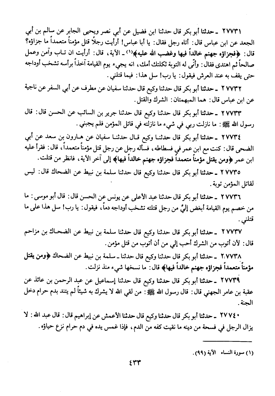 27738 - حَدَّثَنَا أَبُو بَكْرٍ قَالَ: حَدَّثَنَا وَكِيعٌ، قَالَ: حَدَّثَنَا سَلَمَةُ بْنُ نُبَيْطٍ، عَنِ الضَّحَّاكِ: {§وَمَنْ يَقْتُلْ مُؤْمِنًا مُتَعَمِّدًا فَجَزَاؤُهُ جَهَنَّمُ خَالِدًا فِيهَا} [النساء: 93] قَالَ: «مَا نَسَخَهَا شَيْءٌ مُنْذُ نَزَلَتْ»