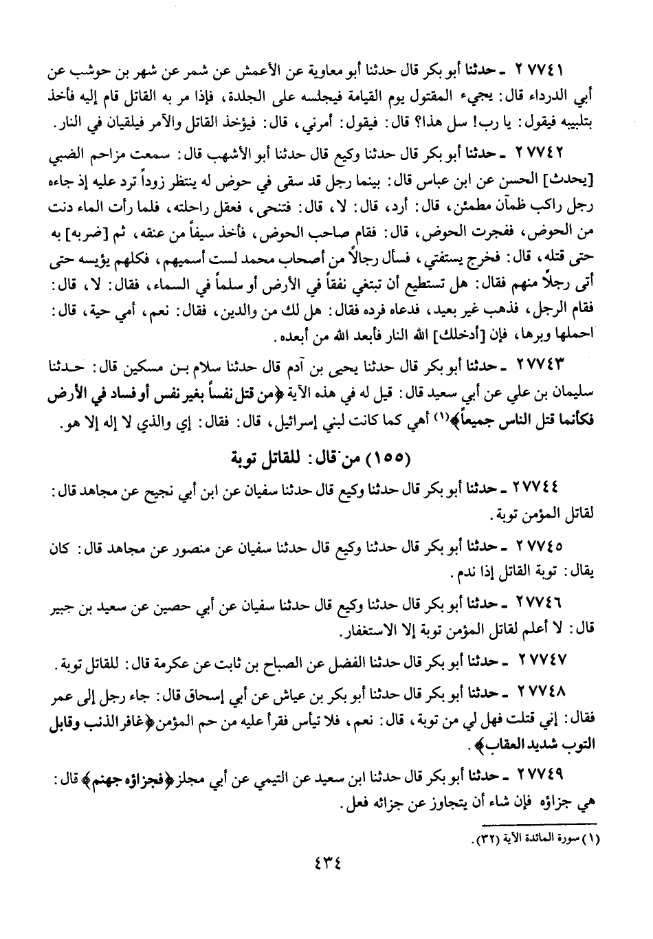 27746 - حَدَّثَنَا أَبُو بَكْرٍ قَالَ: حَدَّثَنَا وَكِيعٌ، قَالَ: حَدَّثَنَا سُفْيَانُ، عَنْ أَبِي حُصَيْنٍ، عَنْ سَعِيدِ بْنِ جُبَيْرٍ، قَالَ: «§لَا أَعْلَمُ لِقَاتِلِ الْمُؤْمِنِ تَوْبَةً إِلَّا الِاسْتِغْفَارُ»