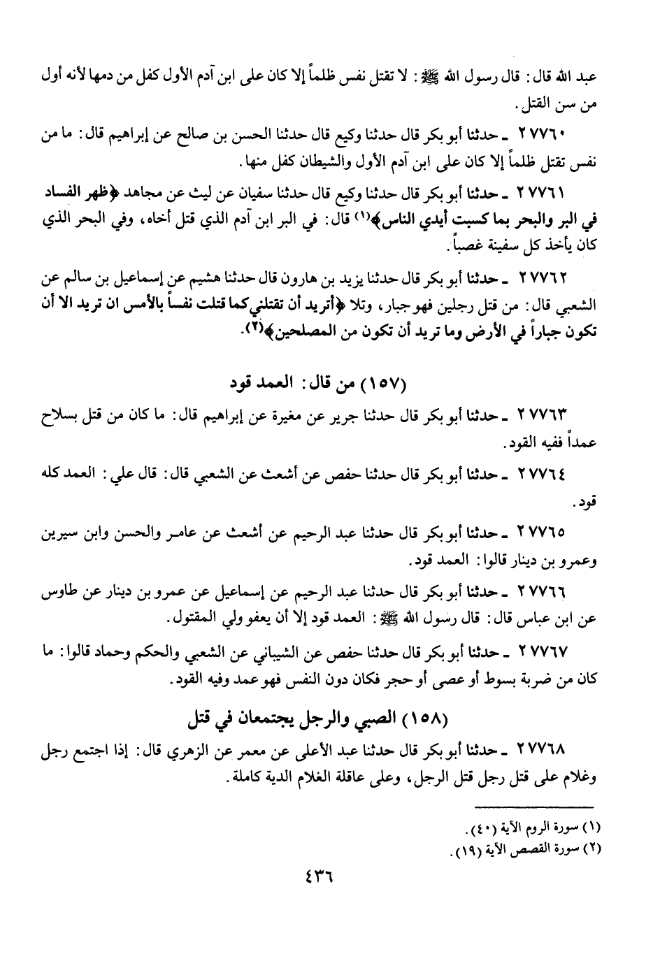 27767 - حَدَّثَنَا أَبُو بَكْرٍ قَالَ: حَدَّثَنَا حَفْصٌ، عَنِ الشَّيْبَانِيِّ، عَنِ الشَّعْبِيِّ، وَالْحَكَمِ، وَحَمَّادٍ، قَالُوا: «§مَا كَانَ مِنْ ضَرْبَةٍ بِسَوْطٍ أَوْ عَصًا أَوْ حَجَرٍ، فَكَانَ دُونَ النَّفْسِ فَهُوَ عَمْدٌ وَفِيهِ الْقَوَدُ»