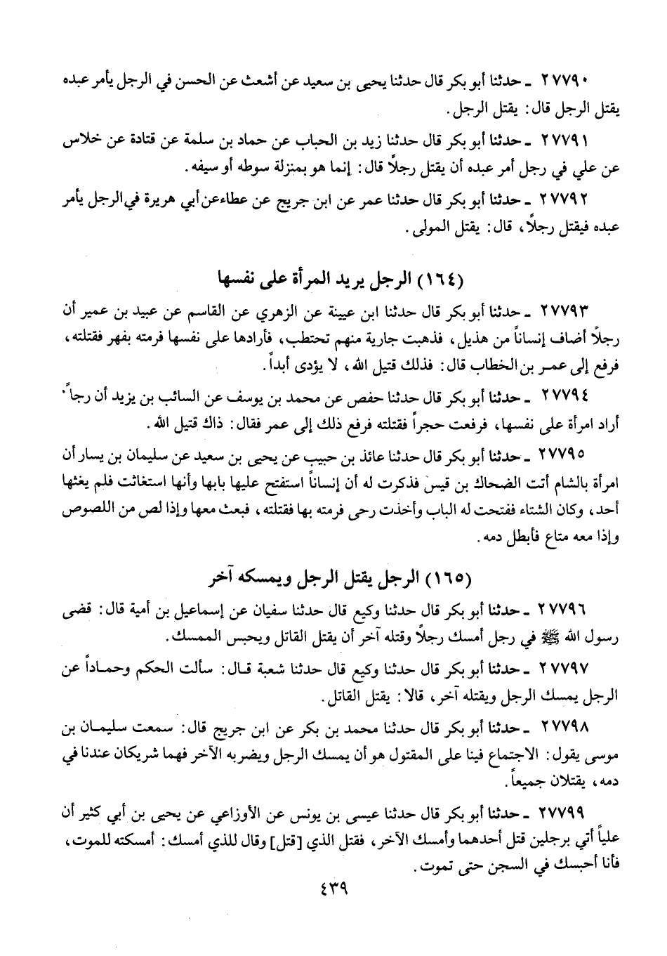 27796 - حَدَّثَنَا أَبُو بَكْرٍ قَالَ: حَدَّثَنَا وَكِيعٌ قَالَ: حَدَّثَنَا سُفْيَانُ، عَنْ إِسْمَاعِيلَ بْنِ أُمَيَّةَ، قَالَ: «§قَضَى رَسُولُ اللَّهِ صَلَّى اللهُ عَلَيْهِ وَسَلَّمَ فِي رَجُلٍ أَمْسَكَ رَجُلًا، وَقَتَلَهُ آخَرُ أَنْ يُقْتَلَ الْقَاتِلُ وَيُحْبَسَ الْمُمْسِكُ»
