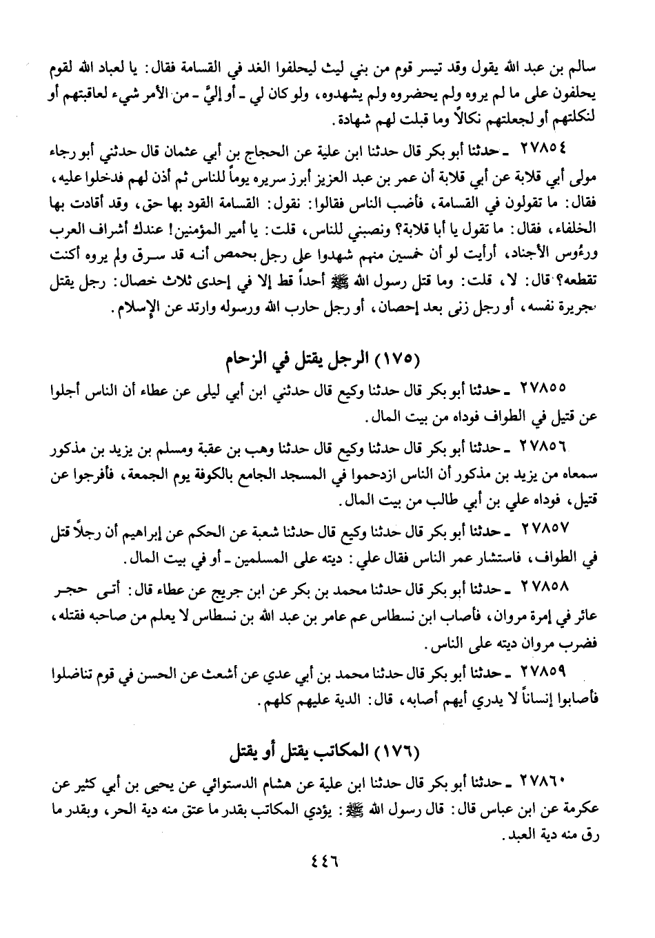 27854 - حَدَّثَنَا أَبُو بَكْرٍ قَالَ: حَدَّثَنَا ابْنُ عُلَيَّةَ، عَنِ الْحَجَّاجِ بْنِ أَبِي عُثْمَانَ، قَالَ: حَدَّثَنِي أَبُو رَجَاءٍ، مَوْلَى أَبِي قِلَابَةَ، عَنْ أَبِي قِلَابَةَ، أَنَّ عُمَرَ بْنَ عَبْدِ الْعَزِيزِ، أَبْرَزَ سَرِيرَهُ يَوْمًا لِلنَّاسِ، ثُمَّ أَذِنَ لَهُمْ فَدَخَلُوا عَلَيْهِ، فَقَالَ: «§مَا تَقُولُونَ فِي الْقَسَامَةِ، فَأَضَبَّ النَّاسُ؟» فَقَالُوا: نَقُولُ: الْقَسَامَةُ الْقَوَدُ بِهَا حَقٌّ، وَقَدْ أَقَادَتْ بِهَا الْخُلَفَاءُ، فَقَالَ: «مَا تَقُولُ يَا أَبَا قِلَابَةَ؟ وَنَصَبَنِي لِلنَّاسِ» قُلْتُ: يَا أَمِيرَ الْمُؤْمِنِينَ عِنْدَكَ أَشْرَافُ الْعَرَبِ وَرُءُوسُ الْأَجْنَادِ، أَرَأَيْتَ لَوْ أَنَّ خَمْسِينَ مِنْهُمْ شَهِدُوا عَلَى رَجُلٍ بِحِمْصٍ أَنَّهُ قَدْ سَرَقَ وَلَمْ يَرَوْهُ أَكُنْتَ تَقْطَعُهُ؟، قَالَ: «لَا» قُلْتُ: وَمَا قَتَلَ رَسُولُ اللَّهِ صَلَّى اللهُ عَلَيْهِ وَسَلَّمَ أَحَدًا قَطُّ إِلَّا فِي إِحْدَى ثَلَاثِ خِصَالٍ رَجُلٍ يُقْتَلُ بِجَرِيرَةِ نَفْسِهِ، أَوْ رَجُلٍ زَنَى بَعْدَ إِحْصَانٍ، أَوْ رَجُلٍ حَارَبَ اللَّهَ وَرَسُولَهُ وَارْتَدَّ عَنِ الْإِسْلَامِ "