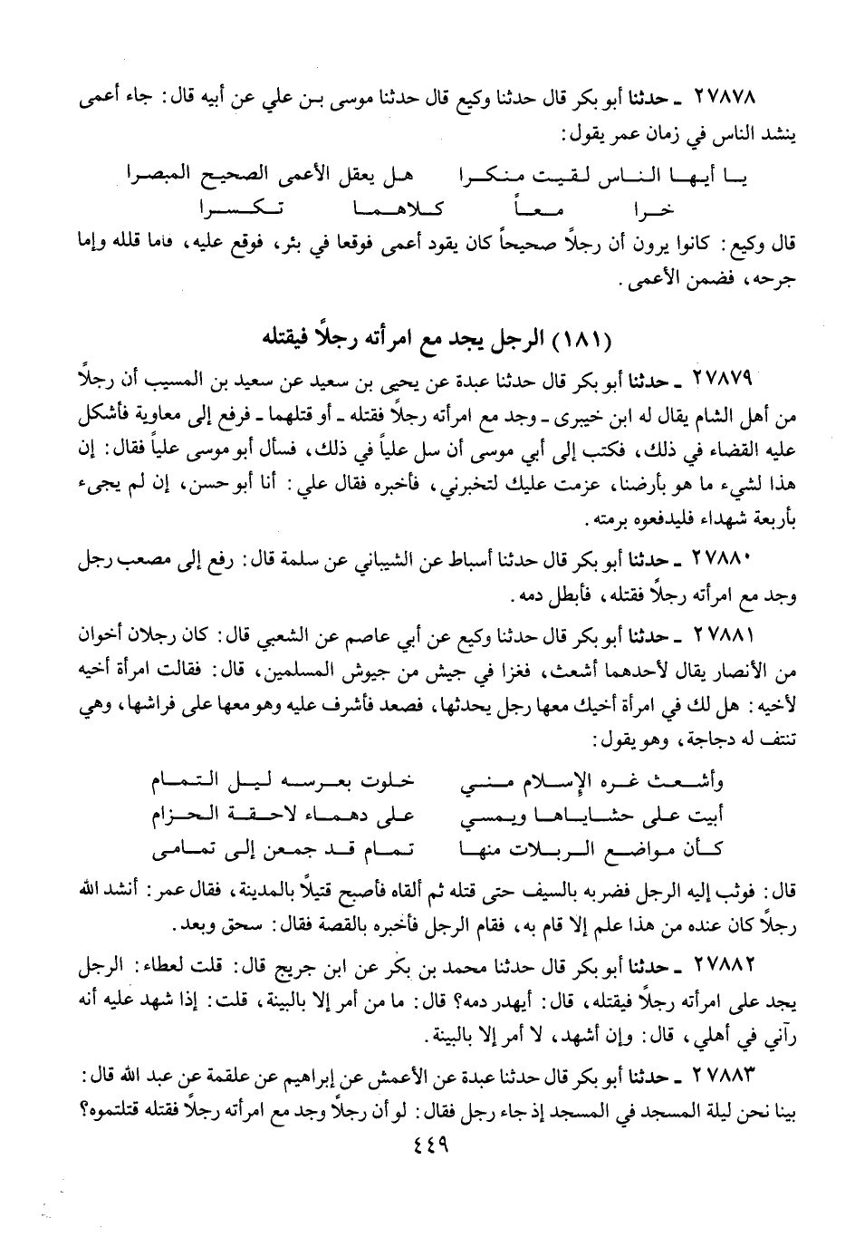 27880 - حَدَّثَنَا أَبُو بَكْرٍ قَالَ: حَدَّثَنَا أَسْبَاطٌ، عَنِ الشَّيْبَانِيِّ، عَنْ سَلَمَةَ، قَالَ: «§رُفِعَ إِلَى مُصْعَبٍ رَجُلٌ وَجَدَ مَعَ امْرَأَتِهِ رَجُلًا فَقَتَلَهُ، فَأَبْطَلَ دَمَهُ»
