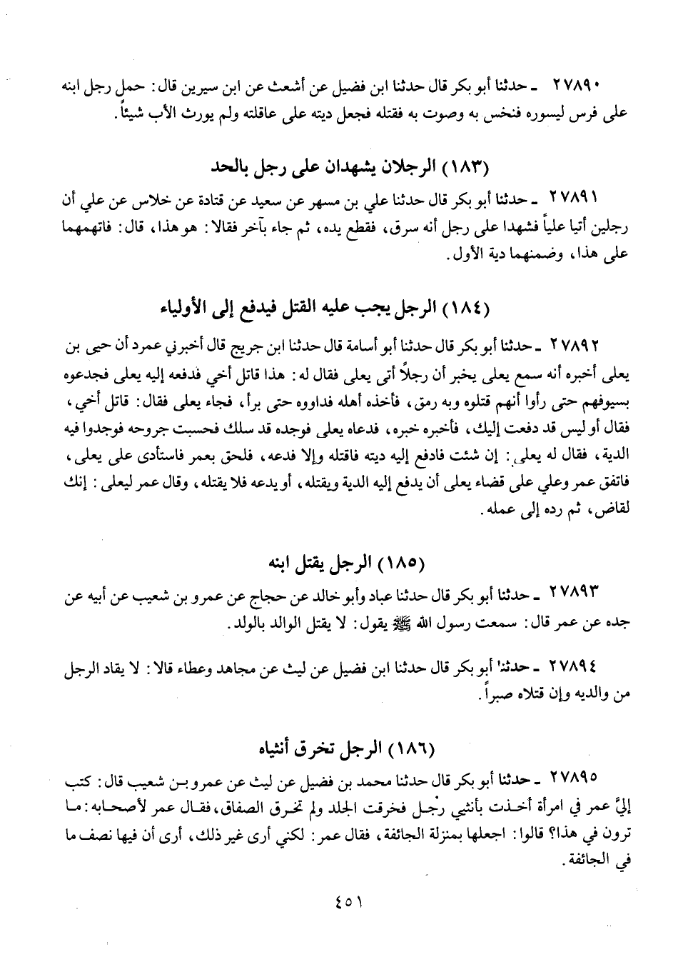 27893 - حَدَّثَنَا أَبُو بَكْرٍ قَالَ: حَدَّثَنَا عَبَّادٌ، وَأَبُو خَالِدٍ، عَنْ حَجَّاجٍ، عَنْ عَمْرِو بْنِ شُعَيْبٍ، عَنْ أَبِيهِ، عَنْ جَدِّهِ، عَنْ عُمَرَ، قَالَ: سَمِعْتُ رَسُولَ اللَّهِ صَلَّى اللهُ عَلَيْهِ وَسَلَّمَ، يَقُولُ: «§لَا يُقْتَلُ الْوَالِدُ بِالْوَلَدِ»