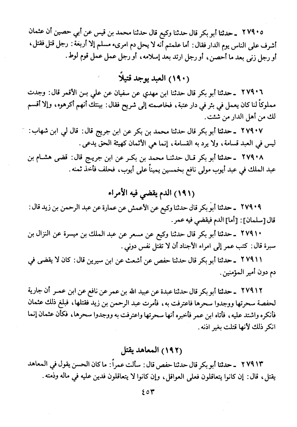 27911 - حَدَّثَنَا أَبُو بَكْرٍ قَالَ: حَدَّثَنَا حَفْصٌ، عَنْ أَشْعَثَ، عَنِ ابْنِ سِيرِينَ، قَالَ: «كَانَ §لَا يَقْضِي فِي دَمٍ دُونَ أَمِيرِ الْمُؤْمِنِينَ»