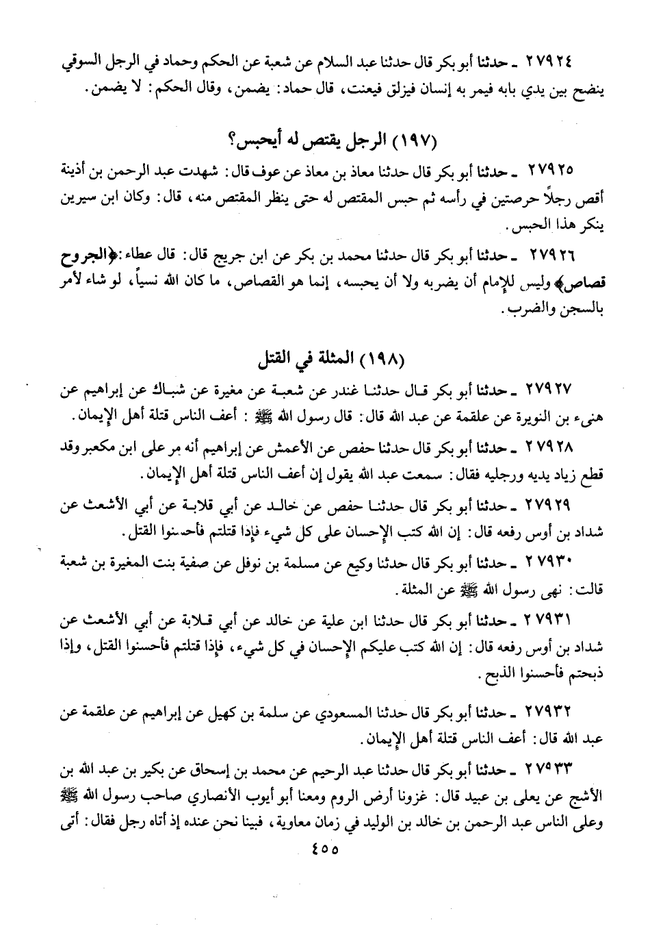 27927 - حَدَّثَنَا أَبُو بَكْرٍ قَالَ: حَدَّثَنَا غُنْدَرٌ، عَنْ شُعْبَةَ، عَنْ مُغِيرَةَ، عَنْ شِبَاكٍ، عَنْ إِبْرَاهِيمَ، عَنْ هُنَيِّ بْنِ النُّوَيْرَةِ، عَنْ عَلْقَمَةَ، عَنْ عَبْدِ اللَّهِ، قَالَ: قَالَ رَسُولُ اللَّهِ صَلَّى اللهُ عَلَيْهِ وَسَلَّمَ: «§أَعَفُّ النَّاسِ قِتْلَةً أَهْلُ الْإِيمَانِ»