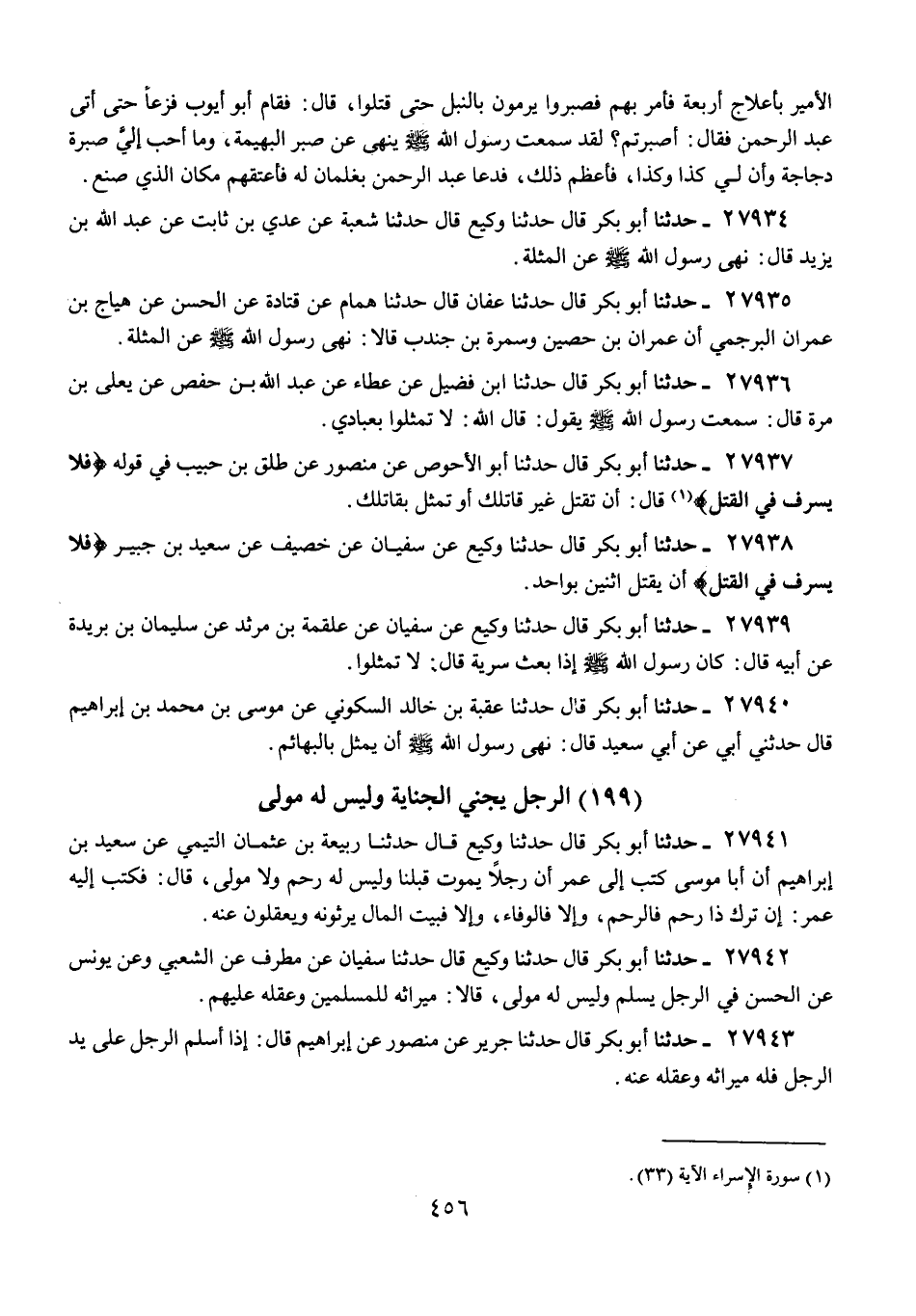 27938 - حَدَّثَنَا أَبُو بَكْرٍ قَالَ: حَدَّثَنَا وَكِيعٌ، عَنْ سُفْيَانَ، عَنْ خُصَيْفٍ، عَنْ سَعِيدِ بْنِ جُبَيْرٍ: {§فَلَا يُسْرِفْ فِي الْقَتْلِ} [الإسراء: 33] أَنْ يَقْتُلَ اثْنَيْنِ بِوَاحِدٍ