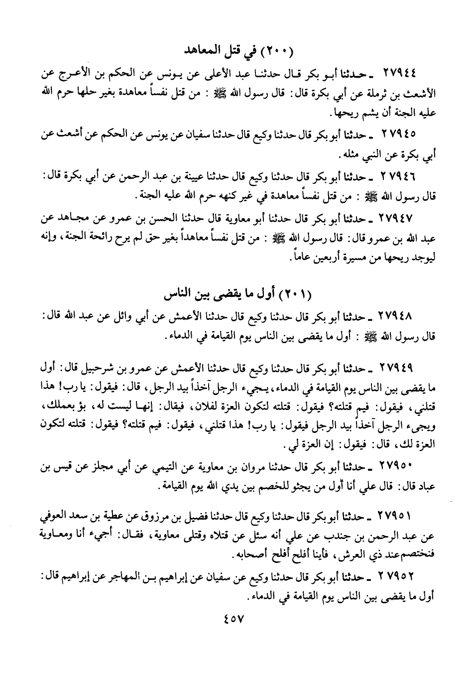 27948 - حَدَّثَنَا أَبُو بَكْرٍ قَالَ: حَدَّثَنَا وَكِيعٌ، قَالَ: حَدَّثَنَا الْأَعْمَشُ، عَنْ أَبِي وَائِلٍ، عَنْ عَبْدِ اللَّهِ، قَالَ: قَالَ رَسُولُ اللَّهِ صَلَّى اللهُ عَلَيْهِ وَسَلَّمَ: «§أَوَّلُ مَا يُقْضَى بَيْنَ النَّاسِ يَوْمَ الْقِيَامَةِ فِي الدِّمَاءِ»