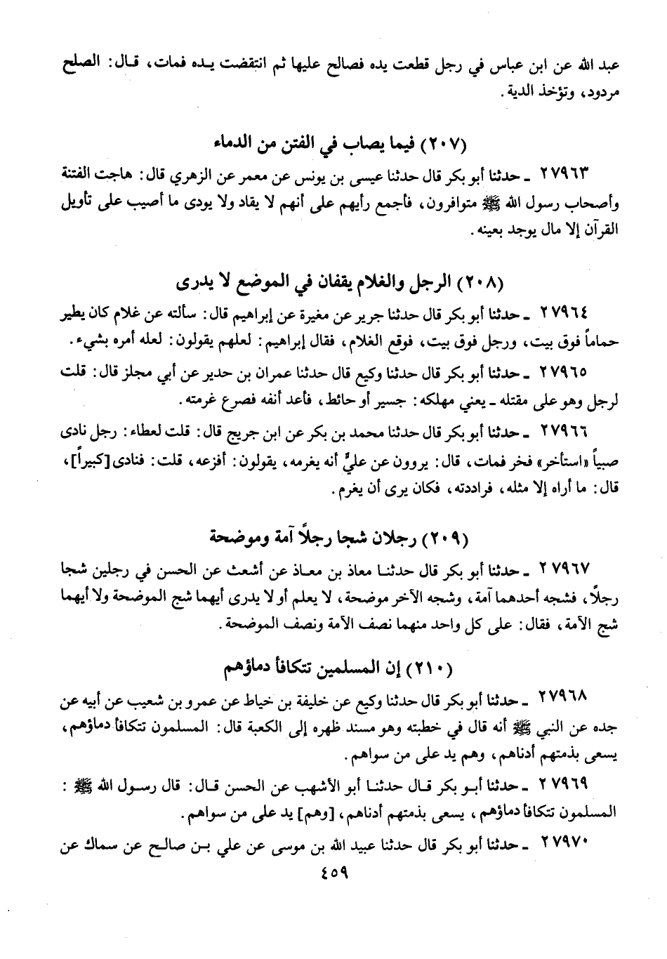 27963 - حَدَّثَنَا أَبُو بَكْرٍ قَالَ: حَدَّثَنَا عِيسَى بْنُ يُونُسَ، عَنْ مَعْمَرٍ، عَنِ الزُّهْرِيِّ، قَالَ: «§هَاجَتِ الْفِتْنَةُ وَأَصْحَابُ رَسُولِ اللَّهِ صَلَّى اللهُ عَلَيْهِ وَسَلَّمَ مُتَوَافِرُونَ، فَأَجْمَعَ رَأْيُهُمْ عَلَى أَنَّهُ لَا يُقَادُ، وَلَا يُودَى مَا أُصِيبَ عَلَى تَأْوِيلِ الْقُرْآنِ إِلَّا مَالٌ يُوجَدُ بِعَيْنِهِ»