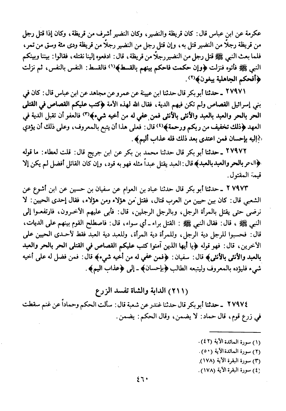 27973 - حَدَّثَنَا أَبُو بَكْرٍ قَالَ: حَدَّثَنَا عَبَّادُ بْنُ الْعَوَّامِ، عَنْ سُفْيَانَ بْنِ حُسَيْنٍ، عَنِ ابْنِ أَشْوَعَ، عَنِ الشَّعْبِيِّ، قَالَ: كَانَ بَيْنَ حَيَّيْنِ مِنَ الْعَرَبِ قِتَالٌ، فَقُتِلَ مِنْ هَؤُلَاءِ وَمِنْ هَؤُلَاءِ، فَقَالَ إِحْدَى الْحَيَّيْنِ: " لَا نَرْضَى حَتَّى يُقْتَلَ بِالْمَرْأَةِ الرَّجُلُ، وَبِالرَّجُلِ الرَّجُلَيْنِ، قَالَ: فَأَبَى عَلَيْهِمِ الْآخَرُونَ، فَارْتَفَعُوا إِلَى النَّبِيِّ صَلَّى اللهُ عَلَيْهِ وَسَلَّمَ، قَالَ: فَقَالَ النَّبِيُّ عَلَيْهِ السَّلَامُ: «§الْقَتْلُ بَرَاءٌ أَيْ سَوَاءٌ» قَالَ: فَاصْطَلَحَ الْقَوْمُ بَيْنَهُمْ عَلَى الدِّيَاتِ، قَالَ: فَحَسَبُوا لِلرَّجُلِ دِيَةَ الرَّجُلِ، وَلِلْمَرْأَةِ دِيَةَ الْمَرْأَةِ، وَلِلْعَبْدِ دِيَةَ الْعَبْدِ فَقَطْ لِإِحْدَى الْحَيَّيْنِ عَلَى الْآخَرِينَ، قَالَ: فَهُوَ قَوْلُهُ: {يَا أَيُّهَا الَّذِينَ آمَنُوا كُتِبَ عَلَيْكُمُ الْقِصَاصُ فِي الْقَتْلَى الْحُرُّ بِالْحُرِّ وَالْعَبْدُ بِالْعَبْدِ وَالْأُنْثَى بِالْأُنْثَى} [البقرة: 178] قَالَ سُفْيَانُ: {فَمَنْ عُفِيَ لَهُ مِنْ أَخِيهِ شَيْءٌ} [البقرة: 178]، قَالَ: فَمَنْ فَضَلَ لَهُ عَلَى أَخِيهِ شَيْءٌ فَلْيُؤَدِّهِ بِالْمَعْرُوفِ، وَلِيَتْبَعهُ الطَّالِبُ بِإِحْسَانٍ إِلَى {عَذَابٌ أَلِيمٌ} [البقرة: 178]