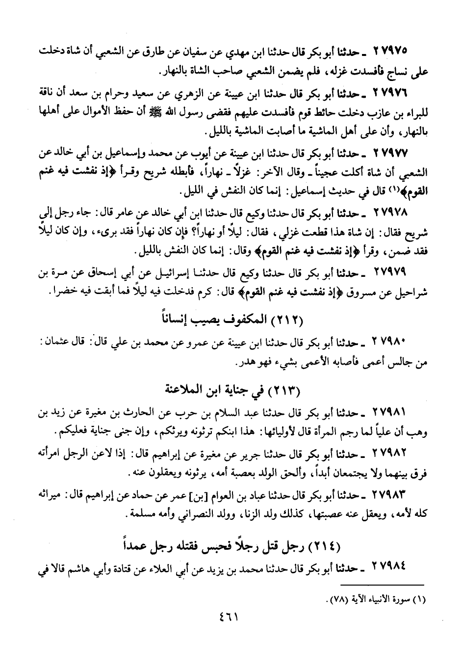 27977 - حَدَّثَنَا أَبُو بَكْرٍ قَالَ: حَدَّثَنَا ابْنُ عُيَيْنَةَ، عَنْ أَيُّوبَ، عَنْ مُحَمَّدٍ، وَإِسْمَاعِيلَ بْنِ أَبِي خَالِدٍ، عَنِ الشَّعْبِيِّ: أَنَّ شَاةً أَكَلَتْ عَجِينًا وَقَالَ الْآخَرُ: غَزْلًا نَهَارًا، فَأَبْطَلَهُ شُرَيْحٌ وَقَرَأَ: " {§إِذْ نَفَشَتْ فِيهِ غَنَمُ الْقَوْمِ} [الأنبياء: 78] " قَالَ فِي حَدِيثِ إِسْمَاعِيلَ: إِنَّمَا كَانَ النَّفْشُ فِي اللَّيْلِ
