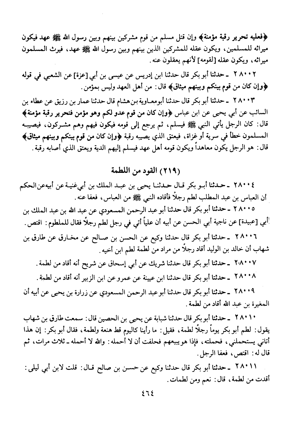 28003 - حَدَّثَنَا أَبُو بَكْرٍ قَالَ: حَدَّثَنَا مُعَاوِيَةَ بْنُ هِشَامٍ، قَالَ: حَدَّثَنَا عَمَّارُ بْنُ رُزَيْقٍ، عَنْ عَطَاءِ بْنِ السَّائِبِ، عَنْ أَبِي يَحْيَى، عَنِ ابْنِ عَبَّاسٍ: {فَإِنْ كَانَ مِنْ قَوْمٍ عَدُوٍّ لَكُمْ وَهُوَ مُؤْمِنٌ فَتَحْرِيرُ رَقَبَةٍ مُؤْمِنَةٍ} [النساء: 92]، قَالَ: كَانَ الرَّجُلُ يَأْتِي النَّبِيَّ عَلَيْهِ السَّلَامُ فَيُسْلِمُ , ثُمَّ يَرْجِعُ إِلَى قَوْمِهِ فَيَكُونُ فِيهِمْ وَهُمْ مُشْرِكُونَ , فَيُصِيبُهُ الْمُسْلِمُونَ خَطَأً فِي سَرِيَّةٍ أَوْ غَزَاةٍ , فَيُعْتِقُ الَّذِي يُصِيبُهُ رَقَبَةً {وَإِنْ كَانَ مِنْ قَوْمٍ بَيْنَكُمْ وَبَيْنَهُمْ مِيثَاقٌ} [النساء: 92]، قَالَ: «§هُوَ الرَّجُلُ يَكُونُ مُعَاهَدًا وَيَكُونُ قَوْمُهُ أَهْلَ عَهْدٍ، فَيُسْلَمُ إِلَيْهِمْ الدِّيَةُ وَيُعْتِقُ الَّذِي أَصَابَهُ رَقَبَةً»