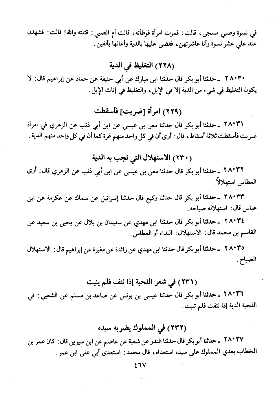 28036 - حَدَّثَنَا أَبُو بَكْرٍ قَالَ: حَدَّثَنَا عِيسَى بْنُ يُونُسَ، عَنْ صَاعِدِ بْنِ مُسْلِمٍ، عَنِ الشَّعْبِيِّ: «§فِي اللِّحْيَةِ الدِّيَةُ إِذَا نُتِفَتْ، فَلَمْ تَنْبُتْ»