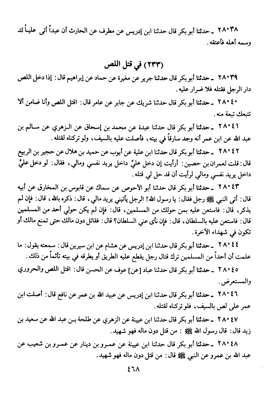 28044 - حَدَّثَنَا أَبُو بَكْرٍ قَالَ: حَدَّثَنَا ابْنُ إِدْرِيسَ، عَنْ هِشَامٍ، عَنِ ابْنِ سِيرِينَ، قَالَ: سَمِعْتُهُ يَقُولُ: «§مَا عَلِمْتُ أَنَّ أَحَدًا مِنَ الْمُسْلِمِينَ تَرَكَ قِتَالَ رَجُلٍ يَقْطَعُ عَلَيْهِ الطَّرِيقَ أَوْ يَطْرُقُهُ فِي بَيْتِهِ تَأَثُّمًا مِنْ ذَلِكَ»