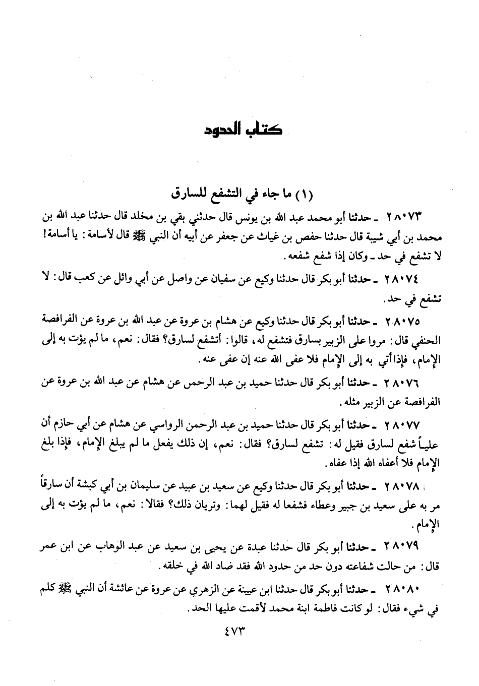 28073 - حَدَّثَنَا أَبُو مُحَمَّدٍ عَبْدُ اللَّهِ بْنُ يُونُسَ قَالَ: حَدَّثَنَا بَقِيُّ بْنُ مَخْلَدٍ قَالَ: حَدَّثَنَا عَبْدُ اللَّهِ بْنُ مُحَمَّدِ بْنِ أَبِي شَيْبَةَ قَالَ: حَدَّثَنَا حَفْصُ بْنُ غِيَاثٍ، عَنْ جَعْفَرٍ، عَنْ أَبِيهِ: أَنَّ النَّبِيَّ صَلَّى اللهُ عَلَيْهِ وَسَلَّمَ قَالَ لِأُسَامَةَ: «يَا أُسَامَةُ، §لَا تَشْفَعْ فِي حَدٍّ» وَكَانَ إِذَا شَفَعَ شَفَّعَهُ