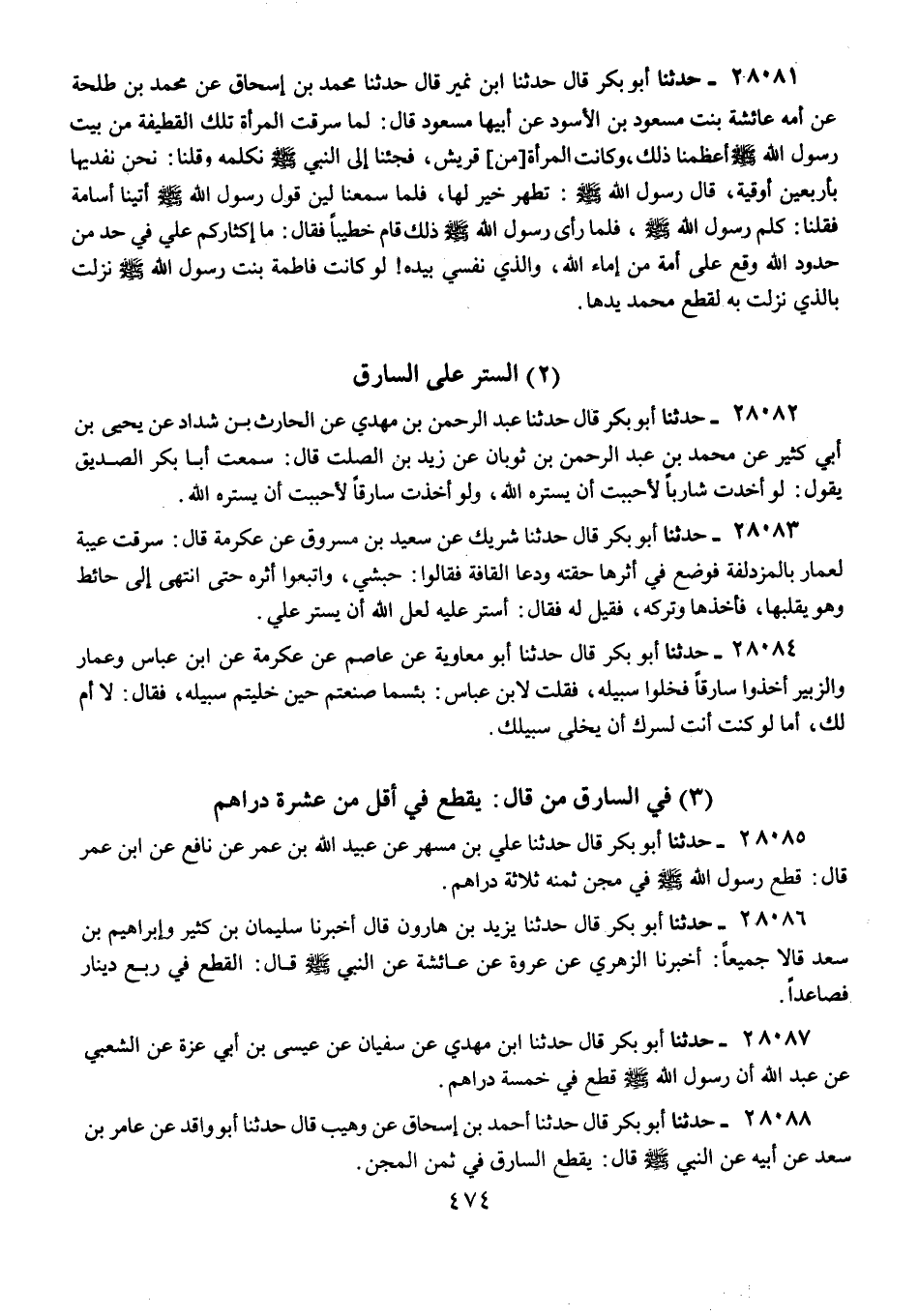 28081 - حَدَّثَنَا أَبُو بَكْرٍ قَالَ: حَدَّثَنَا ابْنُ نُمَيْرٍ، قَالَ: حَدَّثَنَا مُحَمَّدُ بْنُ إِسْحَاقَ، عَنْ مُحَمَّدِ بْنِ طَلْحَةَ، عَنْ أُمِّهِ عَائِشَةَ بِنْتِ مَسْعُودِ بْنِ الْأَسْوَدِ، عَنْ أَبِيهَا مَسْعُودٍ، قَالَ: لَمَّا سَرَقَتِ الْمَرْأَةُ تِلْكَ الْقَطِيفَةَ مِنْ بَيْتِ رَسُولِ اللَّهِ صَلَّى اللهُ عَلَيْهِ وَسَلَّمَ أَعْظَمْنَا ذَلِكَ، وَكَانَتِ الْمَرْأَةُ مِنْ قُرَيْشٍ، فَجِئْنَا إِلَى النَّبِيِّ صَلَّى اللهُ عَلَيْهِ وَسَلَّمَ نُكَلِّمُهُ وَقُلْنَا: نَحْنُ نَفْدِيهَا بِأَرْبَعِينَ أُوقِيَّةً، قَالَ رَسُولُ اللَّهِ صَلَّى اللهُ عَلَيْهِ وَسَلَّمَ: «تَطَّهَّرُ خَيْرٌ لَهَا» فَلَمَّا سَمِعْنَا لِينَ قَوْلِ رَسُولِ اللَّهِ صَلَّى اللهُ عَلَيْهِ وَسَلَّمَ، أَتَيْنَا أُسَامَةَ فَقُلْنَا: كَلِّمْ رَسُولَ اللَّهِ صَلَّى اللهُ عَلَيْهِ وَسَلَّمَ، فَلَمَّا رَأَى رَسُولُ اللَّهِ صَلَّى اللهُ عَلَيْهِ وَسَلَّمَ ذَلِكَ قَامَ خَطِيبًا، قَالَ: «§مَا إِكْثَارُكُمْ عَلَيَّ فِي حَدٍّ مِنْ حُدُودِ اللَّهِ وَقَعَ عَلَى أَمَةٍ مِنْ إِمَاءِ اللَّهِ، وَالَّذِي نَفْسِي بِيَدِهِ، لَوْ كَانَتْ فَاطِمَةُ بِنْتُ رَسُولِ اللَّهِ صَلَّى اللهُ عَلَيْهِ وَسَلَّمَ نَزَلَتْ بِالَّذِي نَزَلَتْ بِهِ لَقَطَعَ مُحَمَّدٌ يَدَهَا»
