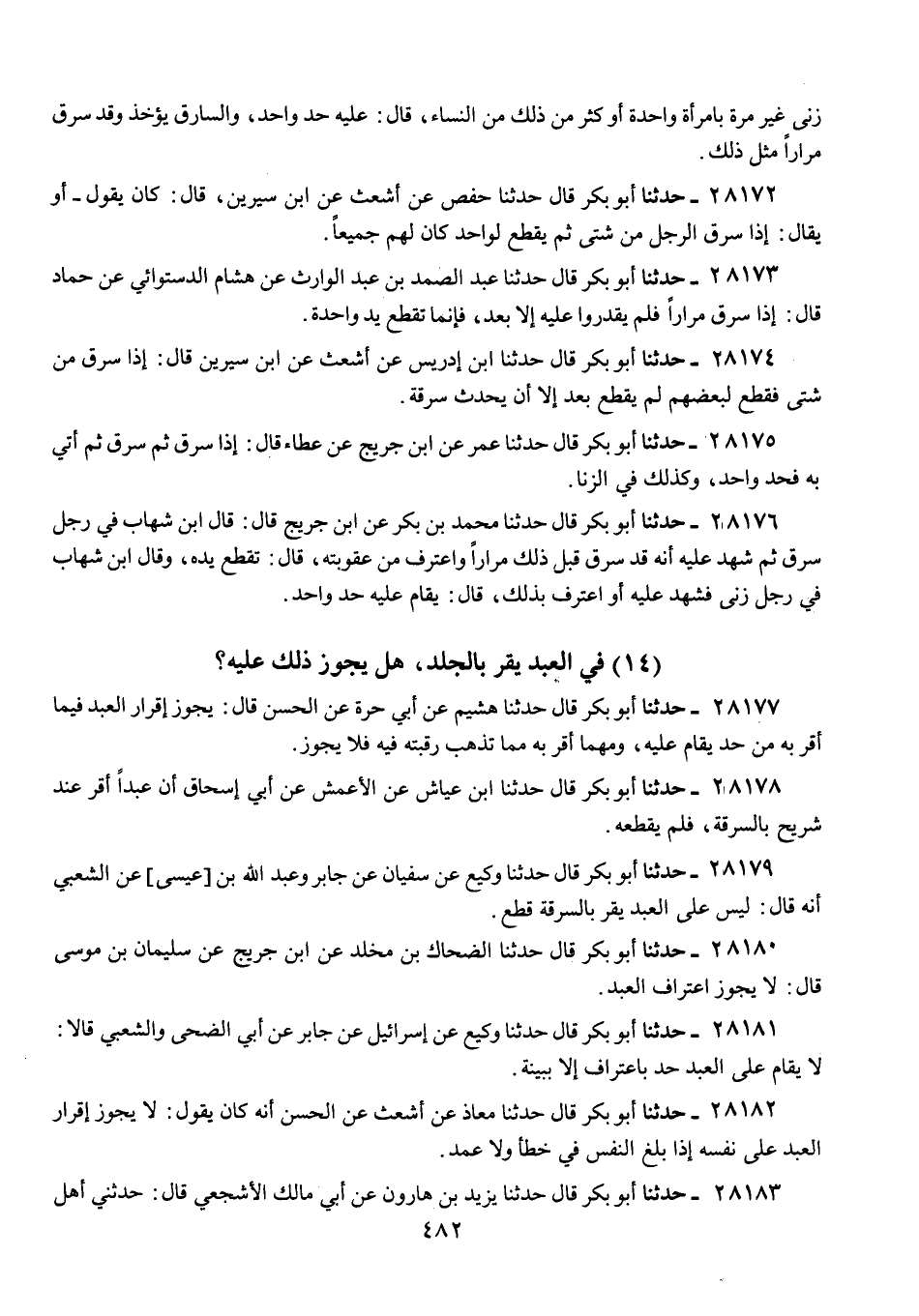 28174 - حَدَّثَنَا أَبُو بَكْرٍ قَالَ: حَدَّثَنَا ابْنُ إِدْرِيسَ، عَنْ أَشْعَثَ، عَنِ ابْنِ سِيرِينَ، قَالَ: «إِذَا §سَرَقَ مِنْ شَتَّى فَقُطِعَ لِبَعْضِهِمْ لَمْ يُقْطَعْ بَعْدُ إِلَّا أَنْ يُحْدِثَ سَرِقَةً»