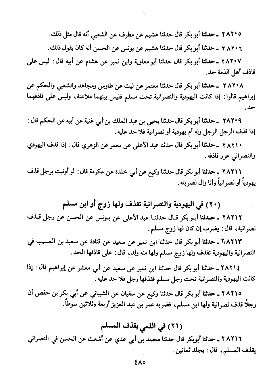 28215 - حَدَّثَنَا أَبُو بَكْرٍ قَالَ: حَدَّثَنَا وَكِيعٌ، عَنْ سُفْيَانَ، عَنِ الشَّيْبَانِيِّ، عَنْ أَبِي بَكْرِ بْنِ حَفْصٍ: «أَنَّ رَجُلًا قَذَفَ نَصْرَانِيَّةً وَلَهَا ابْنٌ مُسْلِمٌ، §فَضَرَبَهُ عُمَرُ بْنُ عَبْدِ الْعَزِيزِ أَرْبَعَةً وَثَلَاثِينَ سَوْطًا»