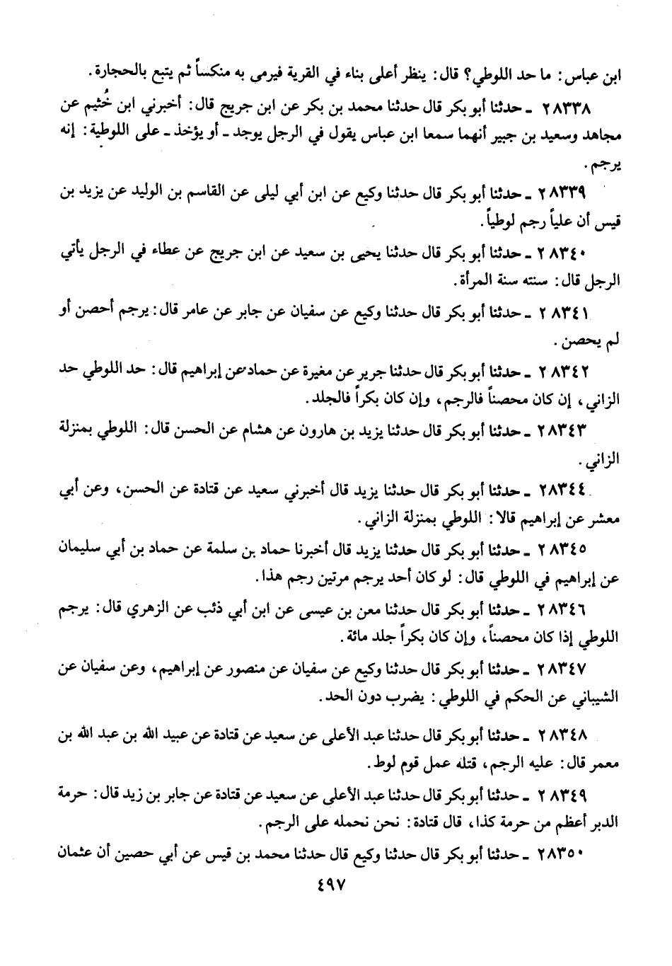 28350 - حَدَّثَنَا أَبُو بَكْرٍ قَالَ: حَدَّثَنَا وَكِيعٌ، قَالَ: حَدَّثَنَا مُحَمَّدُ بْنُ قَيْسٍ، عَنْ أَبِي حُصَيْنٍ: أَنَّ عُثْمَانَ، أَشْرَفَ عَلَى النَّاسِ يَوْمَ الدَّارِ، فَقَالَ: " §أَمَا عَلِمْتُمْ أَنَّهُ لَا يَحِلُّ دَمُ امْرِئٍ مُسْلِمٍ إِلَّا بِأَرْبَعَةٍ: رَجُلٌ عَمِلَ عَمَلَ قَوْمِ لُوطٍ "