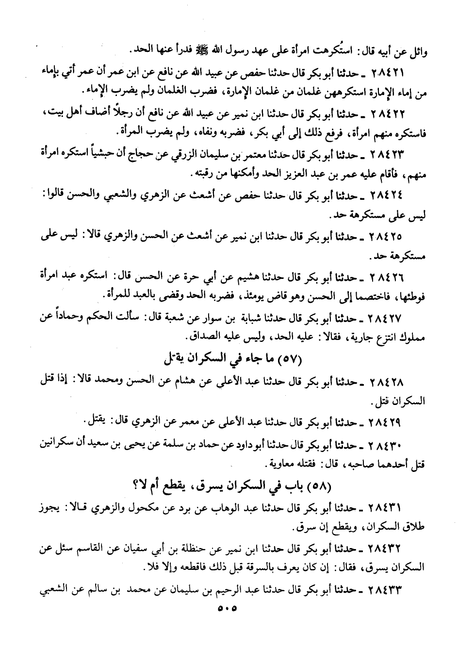28433 - حَدَّثَنَا أَبُو بَكْرٍ قَالَ: حَدَّثَنَا عَبْدُ الرَّحِيمِ بْنُ سُلَيْمَانَ، عَنْ مُحَمَّدِ بْنِ سَالِمٍ، عَنِ الشَّعْبِيِّ، فِي النَّشْوَانِ: «§يُقْطَعُ إِنْ سَرَقَ، وَيُؤْخَذُ لِجِنَايَتِهِ كُلِّهَا»