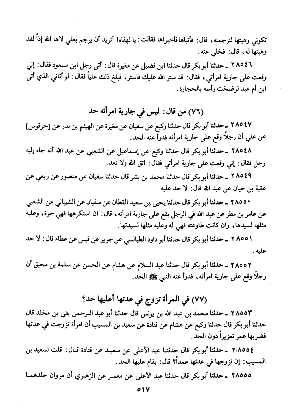 28547 - حَدَّثَنَا أَبُو بَكْرٍ قَالَ: حَدَّثَنَا وَكِيعٌ، عَنْ سُفْيَانَ، عَنْ مُغِيرَةَ، عَنِ الْهَيْثَمِ بْنِ بَدْرٍ، عَنْ حُرْقُوصٍ، عَنْ عَلِيٍّ: «أَنَّ §رَجُلًا وَقَعَ عَلَى جَارِيَةِ امْرَأَتِهِ، فَدَرَأَ عَنْهُ الْحَدَّ»