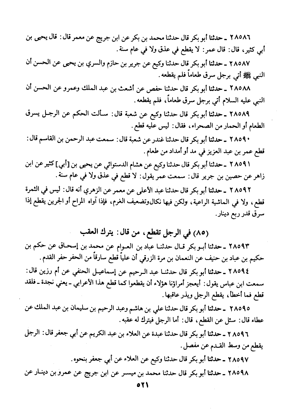 28593 - حَدَّثَنَا أَبُو بَكْرٍ قَالَ: حَدَّثَنَا عَبَّادُ بْنُ الْعَوَّامِ، عَنْ مُحَمَّدِ بْنِ إِسْحَاقَ، عَنْ حَكَمِ بْنِ حَكِيمِ بْنِ عَبَّادِ بْنِ حُنَيْفٍ، عَنِ النُّعْمَانِ بْنِ مُرَّةَ الزُّرَقِيِّ: «أَنَّ عَلِيًّا §قَطَعَ سَارِقًا مِنَ الْحَفْرِ حَفْرِ الْقَدَمِ»