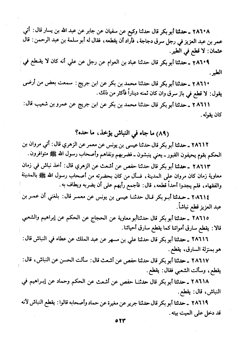 28617 - حَدَّثَنَا أَبُو بَكْرٍ قَالَ: حَدَّثَنَا حَفْصٌ، عَنْ أَشْعَثَ، قَالَ: سَأَلْتُ الْحَسَنَ عَنِ النَّبَّاشِ، قَالَ: «§يُقْطَعُ»، وَسَأَلْتُ الشَّعْبِيَّ، فَقَالَ: «يُقْطَعُ»
