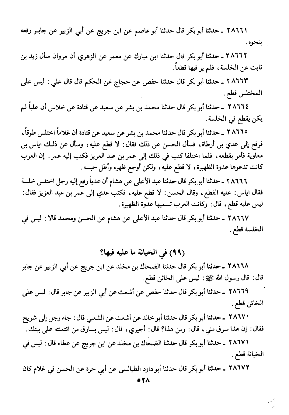 28668 - حَدَّثَنَا أَبُو بَكْرٍ قَالَ: حَدَّثَنَا الضَّحَّاكُ بْنُ مَخْلَدٍ، عَنِ ابْنِ جُرَيْجٍ، عَنْ أَبِي الزُّبَيْرِ، عَنْ جَابِرٍ، قَالَ: قَالَ رَسُولُ اللَّهِ صَلَّى اللهُ عَلَيْهِ وَسَلَّمَ: «§لَيْسَ عَلَى الْخَائِنِ قَطْعٌ»