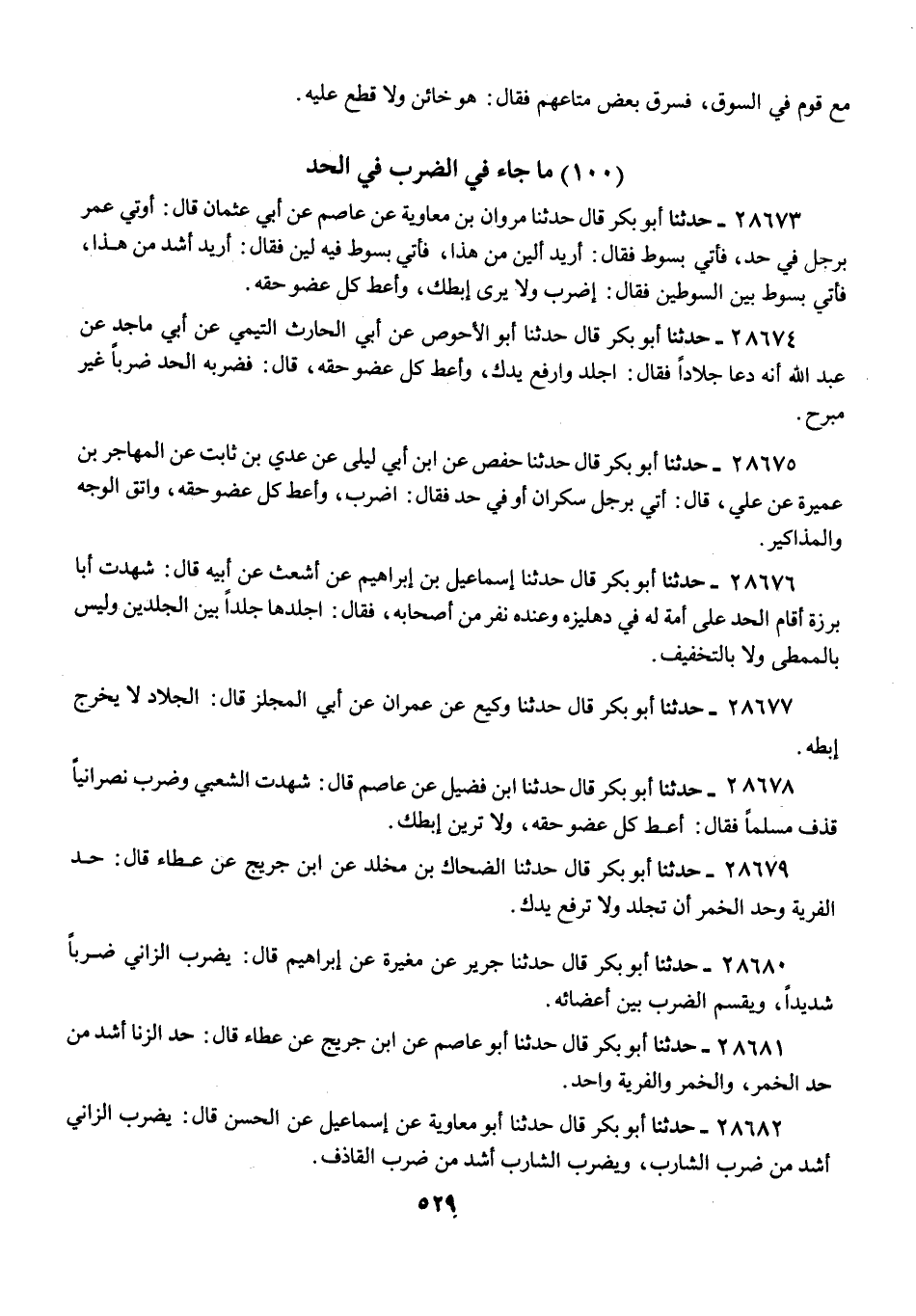 28673 - حَدَّثَنَا أَبُو بَكْرٍ قَالَ: حَدَّثَنَا مَرْوَانُ بْنُ مُعَاوِيَةَ، عَنْ عَاصِمٍ، عَنْ أَبِي عُثْمَانَ، قَالَ: أُتِيَ عُمَرُ بِرَجُلٍ فِي حَدٍّ، فَأُتِيَ بِسَوْطٍ، فَقَالَ: أُرِيدُ أَلْيَنَ مِنْ هَذَا، فَأُتِيَ بِسَوْطٍ فِيهِ لِينٌ، فَقَالَ: أُرِيدُ أَشَدَّ مِنْ هَذَا، فَأُتِيَ بِسَوْطٍ بَيْنَ السَّوْطَيْنِ، فَقَالَ: «§اضْرِبْ وَلَا يُرَى إِبْطُكَ، وَأَعْطِ كُلَّ عُضْوٍ حَقَّهُ»