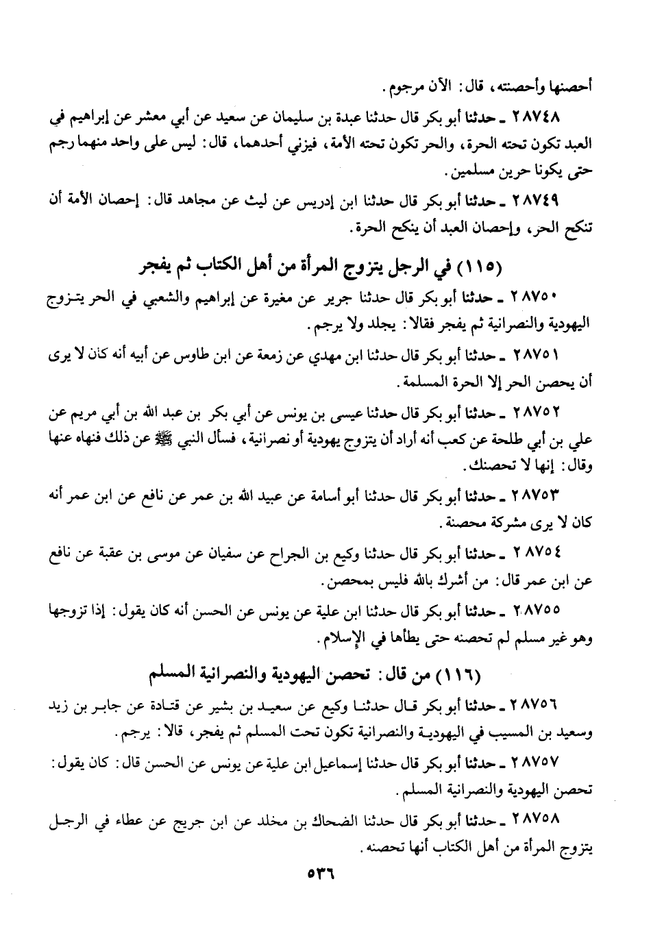 28753 - حَدَّثَنَا أَبُو بَكْرٍ قَالَ: حَدَّثَنَا أَبُو أُسَامَةَ، عَنْ عُبَيْدِ اللَّهِ بْنِ عُمَرَ، عَنْ نَافِعٍ، عَنِ ابْنِ عُمَرَ: «أَنَّهُ كَانَ §لَا يَرَى مُشْرِكَةً مُحْصَنَةً»