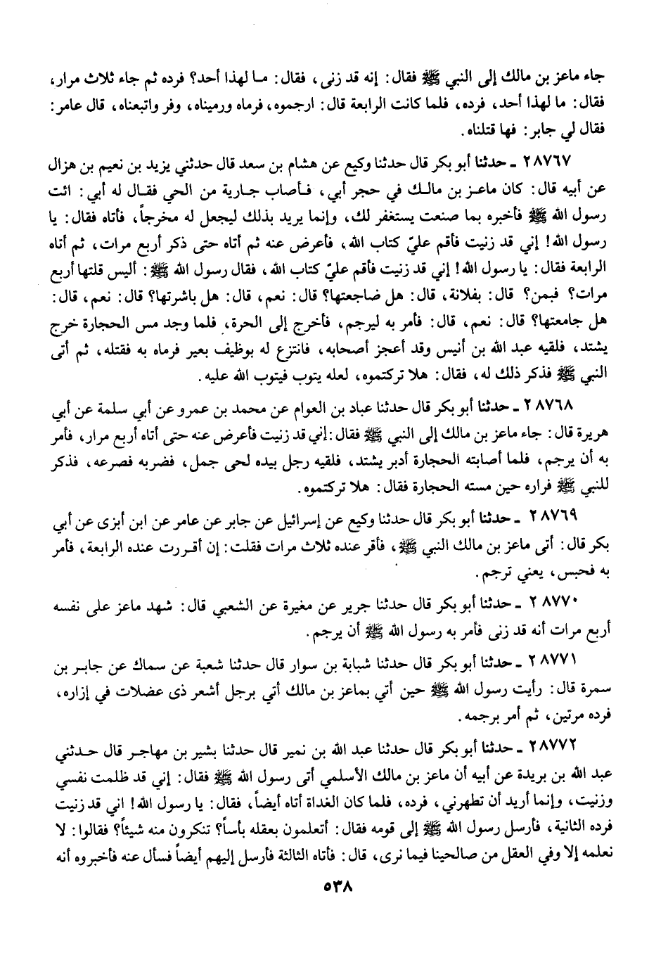 28767 - حَدَّثَنَا أَبُو بَكْرٍ قَالَ: حَدَّثَنَا وَكِيعٌ، عَنْ هِشَامِ بْنِ سَعْدٍ، قَالَ: حَدَّثَنِي يَزِيدُ بْنُ نُعَيْمِ بْنِ هَزَّالٍ، عَنْ أَبِيهِ، قَالَ: كَانَ مَاعِزُ بْنُ مَالِكٍ فِي حِجْرِ أَبِي، فَأَصَابَ جَارِيَةً مِنَ الْحَيِّ، فَقَالَ لَهُ أَبِي: ائْتِ رَسُولَ اللَّهِ صَلَّى اللهُ عَلَيْهِ وَسَلَّمَ فَأَخْبِرْهُ بِمَا صَنَعْتَ يَسْتَغْفِرْ لَكَ، وَإِنَّمَا يُرِيدُ بِذَلِكَ لِيَجْعَلَ لَهُ مَخْرَجًا، فَأَتَاهُ، فَقَالَ: يَا رَسُولَ اللَّهِ، إِنِّي قَدْ زَنَيْتُ فَأَقِمْ عَلَيَّ كِتَابَ اللَّهِ، فَأَعْرَضَ عَنْهُ، ثُمَّ أَتَاهُ حَتَّى ذَكَرَ أَرْبَعَ مَرَّاتٍ، ثُمَّ أَتَاهُ الرَّابِعَةَ، فَقَالَ: يَا رَسُولَ اللَّهِ، إِنِّي قَدْ زَنَيْتُ فَأَقِمْ عَلَيَّ كِتَابَ اللَّهِ، فَقَالَ رَسُولُ اللَّهِ صَلَّى اللهُ عَلَيْهِ وَسَلَّمَ: «أَلَيْسَ قُلْتُهَا أَرْبَعَ مَرَّاتٍ؟ فَبِمَنْ؟»، قَالَ: بِفُلَانَةَ، قَالَ: «هَلْ ضَاجَعْتَهَا؟»، قَالَ: نَعَمْ، قَالَ: «بَاشَرْتَهَا؟»، قَالَ: نَعَمْ، قَالَ: «هَلْ جَامَعْتَهَا؟»، قَالَ: نَعَمْ، قَالَ: فَأَمَرَ بِهِ لِيُرْجَمَ، فَأُخْرِجَ إِلَى الْحَرَّةِ، فَلَمَّا وَجَدَ مَسَّ الْحِجَارَةِ خَرَجَ يَشْتَدُّ، فَلَقِيَهُ عَبْدُ اللَّهِ بْنُ أُنَيْسٍ وَقَدْ أَعْجَزَ أَصْحَابَهُ، فَانْتَزَعَ لَهُ بِوَظِيفِ بَعِيرٍ فَرَمَاهُ بِهِ فَقَتَلَهُ، ثُمَّ أَتَى النَّبِيَّ صَلَّى اللهُ عَلَيْهِ وَسَلَّمَ فَذَكَرَ ذَلِكَ لَهُ، فَقَالَ: «§هَلَّا تَرَكْتُمُوهُ، لَعَلَّهُ يَتُوبُ فَيَتُوبَ اللَّهُ عَلَيْهِ»