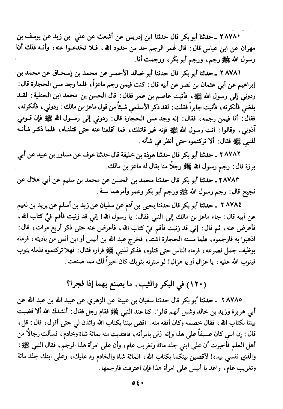 28781 - حَدَّثَنَا أَبُو بَكْرٍ قَالَ: حَدَّثَنَا أَبُو خَالِدٍ الْأَحْمَرُ، عَنْ مُحَمَّدِ بْنِ إِسْحَاقَ، عَنْ مُحَمَّدِ بْنِ إِبْرَاهِيمَ، عَنْ أَبِي الهَيْثَمِ بْنِ نَصْرٍ، عَنْ أَبِيهِ، قَالَ: كُنْتُ فِيمَنْ رَجَمَ مَاعِزًا، فَلَمَّا وَجَدَ مَسَّ الْحِجَارَةِ، قَالَ: رُدُّونِي إِلَى رَسُولِ اللَّهِ صَلَّى اللهُ عَلَيْهِ وَسَلَّمَ، فَأَتَيْتُ عَاصِمَ بْنَ عُمَرَ، فَقَالَ: قَالَ الْحَسَنُ بْنُ مُحَمَّدِ ابْنِ الْحَنَفِيَّةِ: لَقَدْ بَلَغَنِي فَأَنْكَرْتُهُ، فَأَتَيْتُ جَابِرًا فَقُلْتُ: لَقَدْ ذَكَرَ الْأَسْلَمِيُّ شَيْئًا مِنْ قَوْلِ مَاعِزِ بْنِ مَالِكٍ: رُدُّونِي، فَأَنْكَرْتُهُ، فَقَالَ: أَنَا فِيمَنْ رَجَمَهُ، فَقَالَ: إِنَّهُ وَجَدَ مَسَّ الْحِجَارَةِ، قَالَ: رُدُّونِي إِلَى رَسُولِ اللَّهِ صَلَّى اللهُ عَلَيْهِ وَسَلَّمَ فَإِنَّ قَوْمِي آذَوْنِي، وَقَالُوا: ائْتِ رَسُولَ اللَّهِ صَلَّى اللهُ عَلَيْهِ وَسَلَّمَ فَإِنَّهُ غَيْرُ قَاتِلِكَ، فَمَا أَقْلَعْنَا عَنْهُ حَتَّى قَتَلْنَاهُ، فَلَمَّا ذُكِرَ شَأْنُهُ لِلنَّبِيِّ صَلَّى اللهُ عَلَيْهِ وَسَلَّمَ، فَقَالَ: «§أَلَا تَرَكْتُمُوهُ حَتَّى أَنْظُرَ فِي شَأْنِهِ»