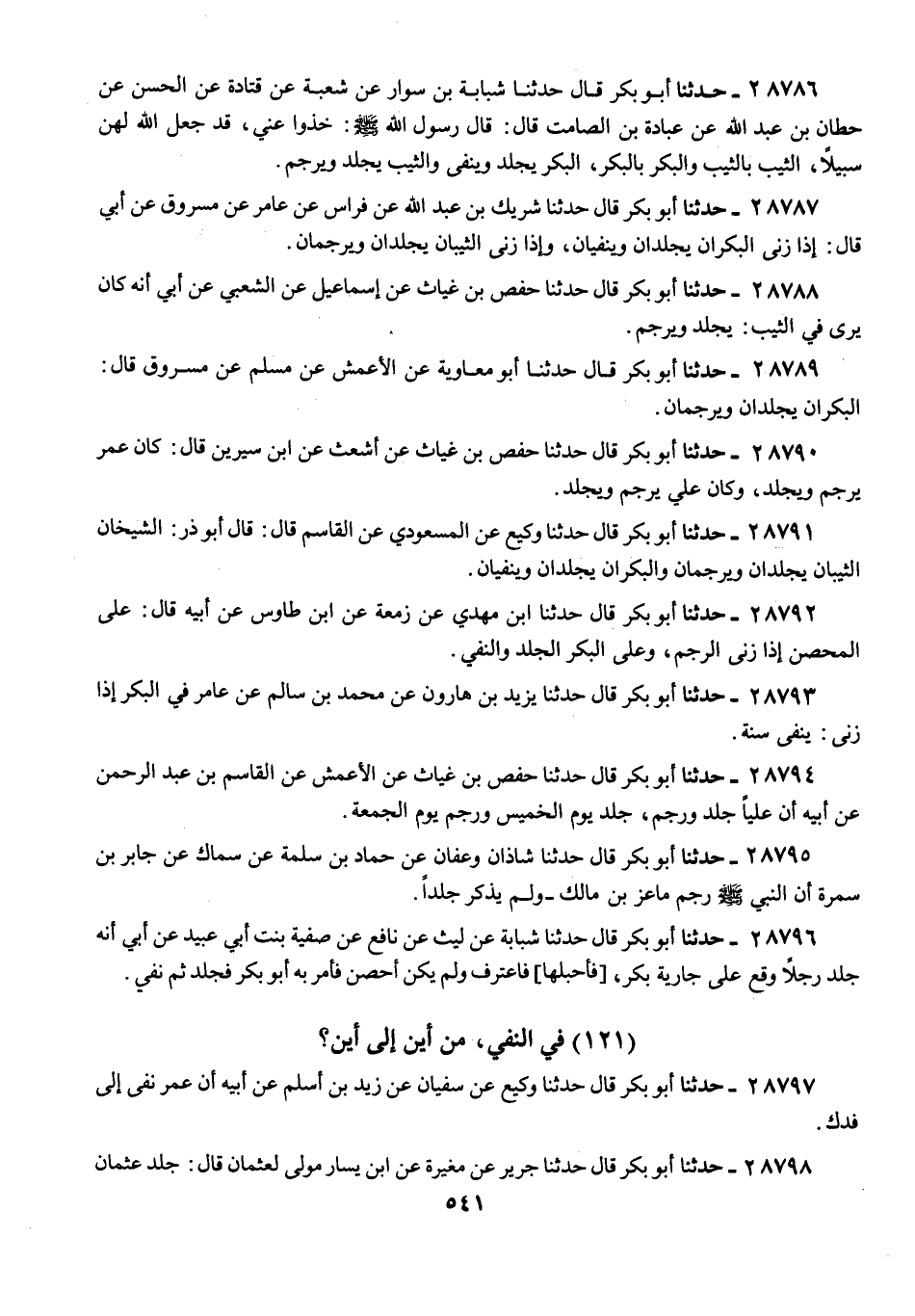 28786 - حَدَّثَنَا أَبُو بَكْرٍ قَالَ: حَدَّثَنَا شَبَابَةُ بْنُ سَوَّارٍ، عَنْ شُعْبَةَ، عَنْ قَتَادَةَ، عَنِ الْحَسَنِ، عَنْ حِطَّانَ بْنِ عَبْدِ اللَّهِ، عَنْ عُبَادَةَ بْنِ الصَّامِتِ، قَالَ: قَالَ رَسُولُ اللَّهِ صَلَّى اللهُ عَلَيْهِ وَسَلَّمَ: «§خُذُوا عَنِّي قَدْ جَعَلَ اللَّهُ لَهُنَّ سَبِيلًا، الثَّيِّبُ بِالثَّيِّبِ وَالْبِكْرُ بِالْبِكْرِ، الْبِكْرُ يُجْلَدُ وَيُنْفَى، وَالثَّيِّبُ يُجْلَدُ وَيُرْجَمُ»