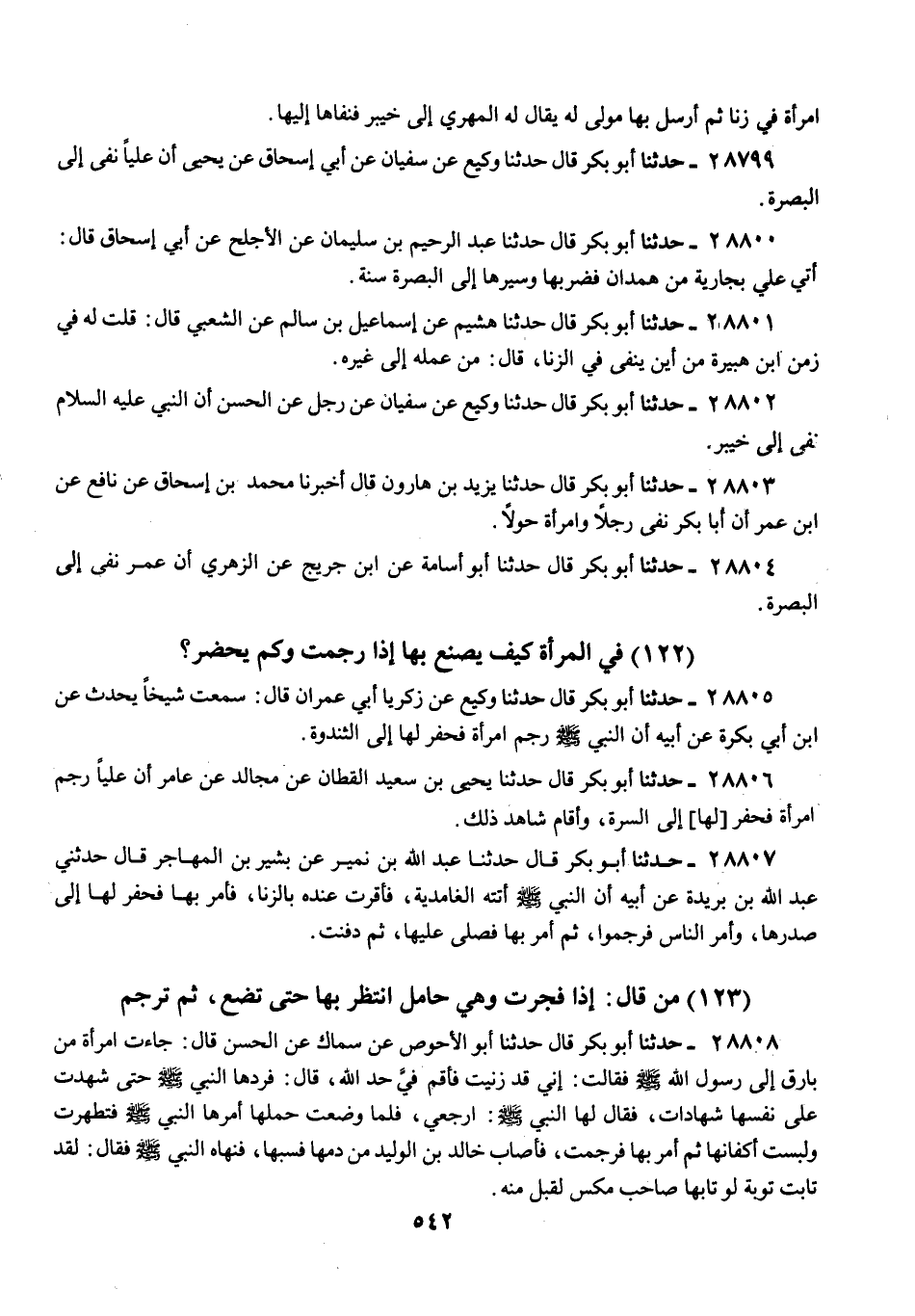 28807 - حَدَّثَنَا أَبُو بَكْرٍ قَالَ: حَدَّثَنَا عَبْدُ اللَّهِ بْنُ نُمَيْرٍ، عَنْ بَشِيرِ بْنِ الْمُهَاجِرِ، قَالَ: حَدَّثَنِي عَبْدُ اللَّهِ بْنُ بُرَيْدَةَ، عَنْ أَبِيهِ: «أَنَّ النَّبِيَّ صَلَّى اللهُ عَلَيْهِ وَسَلَّمَ أَتَتْهُ الْغَامِدِيَّةُ، فَأَقَرَّتْ عِنْدَهُ بِالزِّنَا §فَأَمَرَ بِهَا، فَحُفِرَ لَهَا إِلَى صَدْرِهَا، وَأَمَرَ النَّاسَ فَرَجَمُوا، ثُمَّ أَمَرَ بِهَا فَصَلَّى عَلَيْهَا، ثُمَّ دُفِنَتْ»