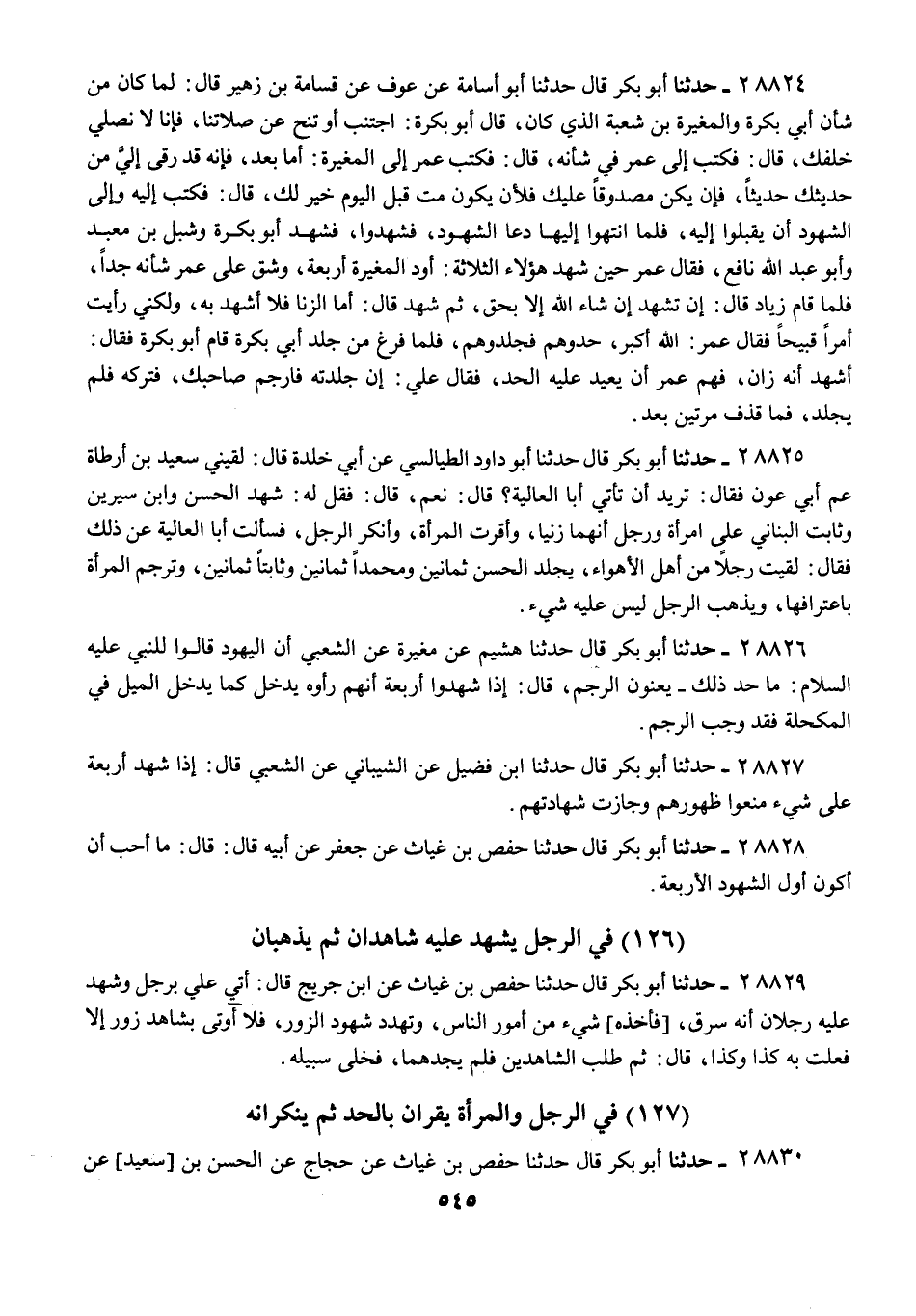28826 - حَدَّثَنَا أَبُو بَكْرٍ قَالَ: حَدَّثَنَا هُشَيْمٌ، عَنْ مُغِيرَةَ، عَنِ الشَّعْبِيِّ: أَنَّ الْيَهُودَ قَالُوا لِلنَّبِيِّ عَلَيْهِ السَّلَامُ: مَا حَدُّ ذَلِكَ؟ يَعْنُونَ الرَّجْمَ، قَالَ: «§إِذَا شَهِدُوا أَرْبَعَةٌ أَنَّهُمْ رَأَوْهُ يَدْخُلُ كَمَا يَدْخُلُ الْمِيلُ فِي الْمُكْحُلَةِ، فَقَدْ وَجَبَ الرَّجْمُ»