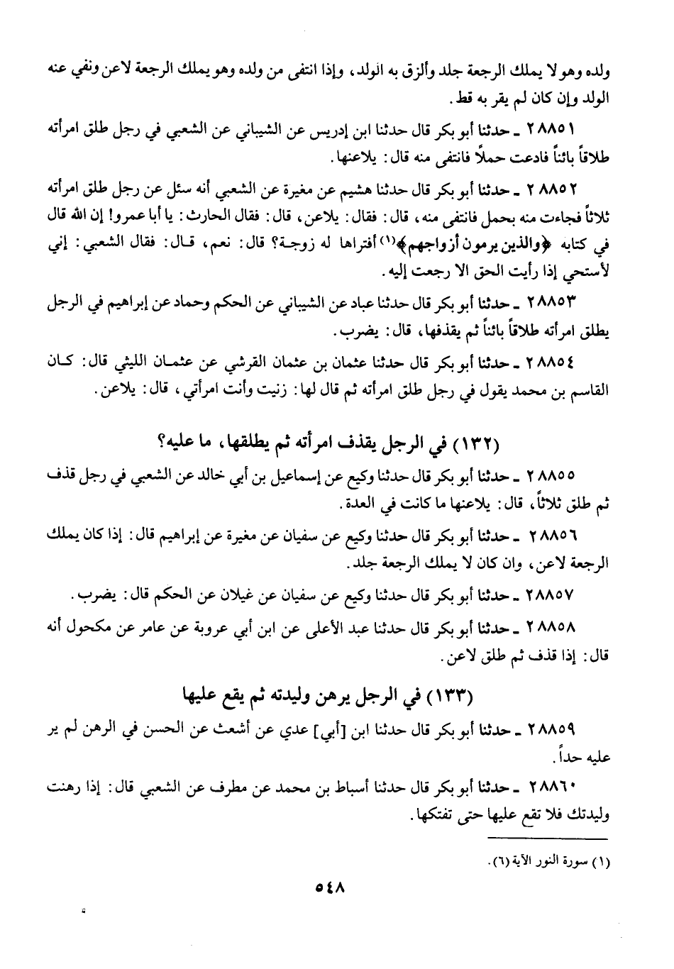 28856 - حَدَّثَنَا أَبُو بَكْرٍ قَالَ: حَدَّثَنَا وَكِيعٌ، عَنْ سُفْيَانَ، عَنْ مُغِيرَةَ، عَنْ إِبْرَاهِيمَ، قَالَ: «§إِذَا كَانَ يَمْلِكُ الرَّجْعَةَ لَاعَنَ، وَإِنْ كَانَ لَا يَمْلِكُ الرَّجْعَةَ جُلِدَ»