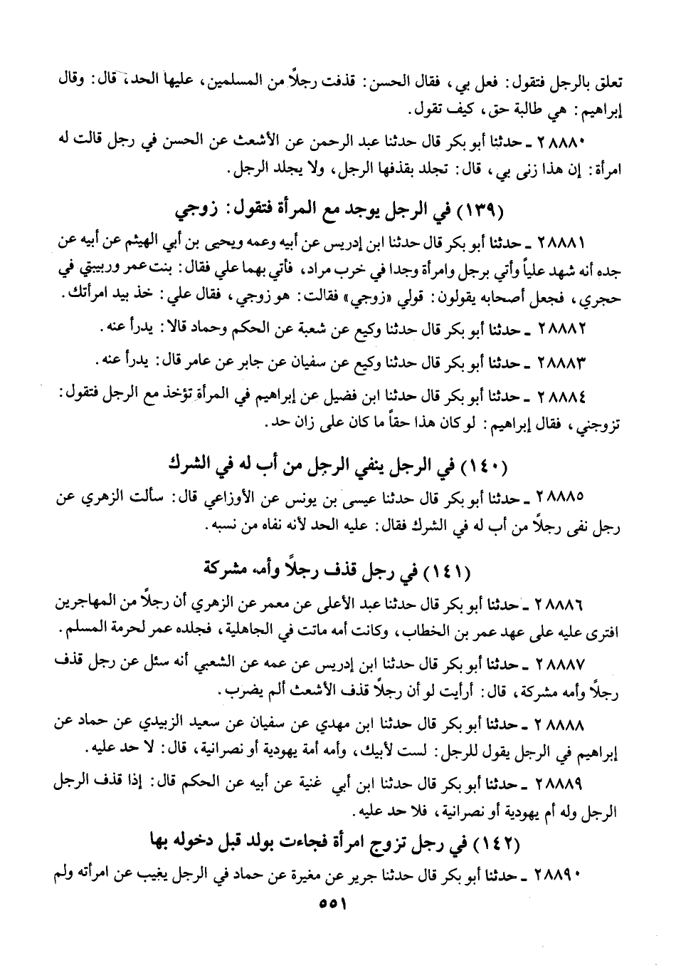 28885 - حَدَّثَنَا أَبُو بَكْرٍ قَالَ: حَدَّثَنَا عِيسَى بْنُ يُونُسَ، عَنِ الْأَوْزَاعِيِّ، قَالَ: سَأَلْتُ الزُّهْرِيَّ عَنْ رَجُلٍ نَفَى رَجُلًا مِنْ أَبٍ لَهُ فِي الشِّرْكِ، فَقَالَ: «§عَلَيْهِ الْحَدُّ لِأَنَّهُ نَفَاهُ مِنْ نَسَبِهِ»