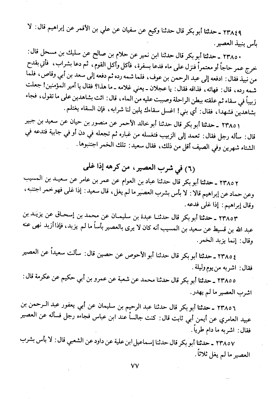 23852 - حَدَّثَنَا أَبُو بَكْرٍ قَالَ: حَدَّثَنَا عَبَّادُ بْنُ الْعَوَّامِ، عَنْ عُمَرَ بْنِ عَامِرٍ، عَنْ سَعِيدِ بْنِ الْمُسَيِّبِ، وَعَنْ حَمَّادٍ، عَنْ إِبْرَاهِيمَ، قَالَا: «§لَا بَأْسَ بِشُرْبِ الْعَصِيرِ مَا لَمْ يُغْلَ»، قَالَ سَعِيدٌ: «إِذَا غُلِيَ فَهُوَ خَمْرٌ، اجْتَنِبْهُ»، وَقَالَ إِبْرَاهِيمُ: «إِذَا غُلِيَ فَدَعْهُ»