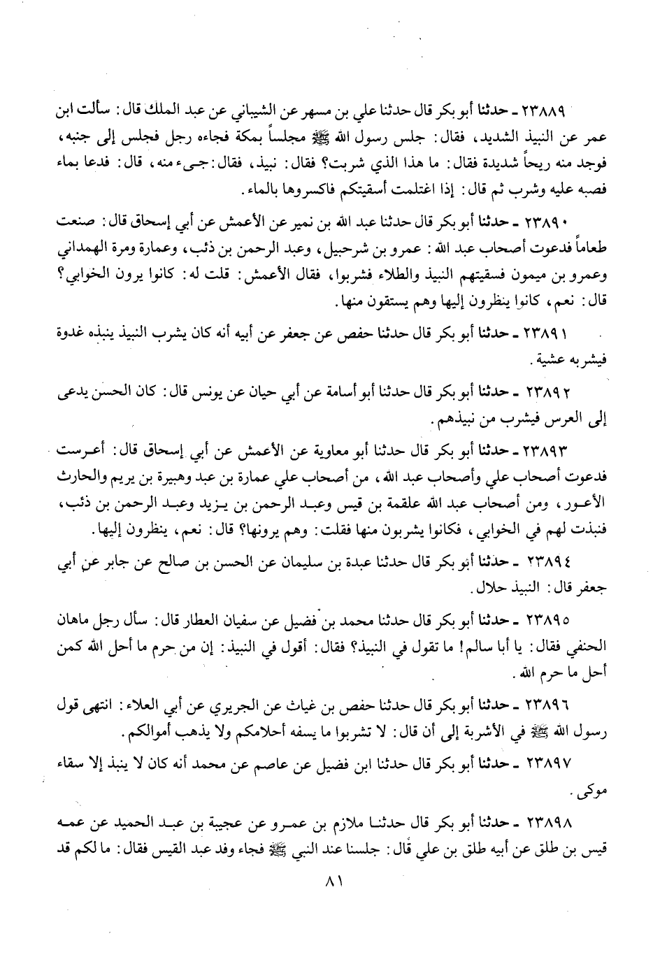 23889 - حَدَّثَنَا أَبُو بَكْرٍ قَالَ: حَدَّثَنَا عَلِيُّ بْنُ مُسْهِرٍ، عَنِ الشَّيْبَانِيِّ، عَنْ عَبْدِ الْمَلِكِ، قَالَ: سَأَلْتُ ابْنَ عُمَرَ عَنِ النَّبِيذِ الشَّدِيدِ، فَقَالَ: جَلَسَ رَسُولُ اللَّهِ صَلَّى اللهُ عَلَيْهِ وَسَلَّمَ مَجْلِسًا بِمَكَّةَ فَجَاءَهُ رَجُلٌ فَجَلَسَ إِلَى جَنْبِهِ، فَوَجَدَ مِنْهُ رِيحًا شَدِيدَةً فَقَالَ: «مَا هَذَا الَّذِي شَرِبْتَ؟» فَقَالَ: نَبِيذٌ، فَقَالَ: «جِئْ مِنْهُ» قَالَ: فَدَعَا بِمَاءٍ فَصَبَّهُ عَلَيْهِ وَشَرِبَ، ثُمَّ قَالَ: «§إِذَا اغْتَلَمَتْ أَسْقِيَتُكُمْ فَاكْسِرُوهَا بِالْمَاءِ»