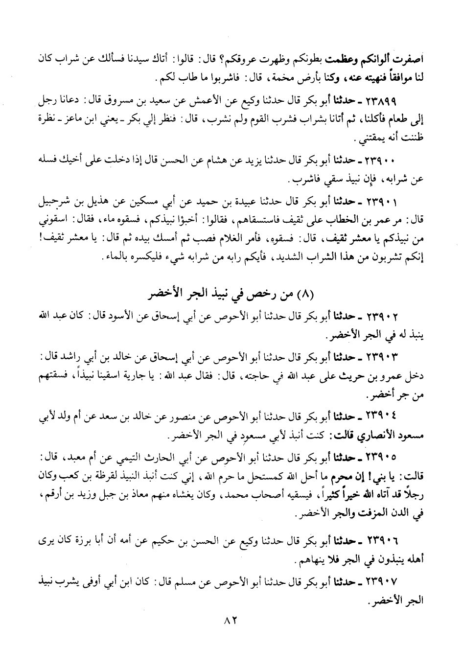 23907 - حَدَّثَنَا أَبُو بَكْرٍ قَالَ: حَدَّثَنَا أَبُو الْأَحْوَصِ، عَنْ مُسْلِمٍ، قَالَ: كَانَ ابْنُ أَبِي أَوْفَى «§يَشْرَبُ نَبِيذَ الْجَرِّ الْأَخْضَرِ» -[83]-.