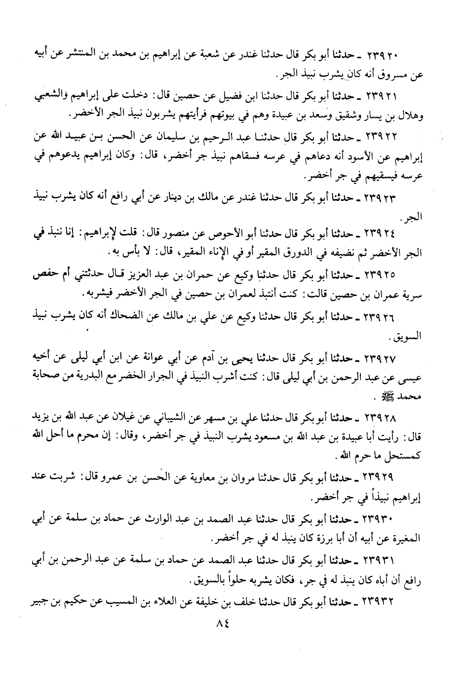 23921 - حَدَّثَنَا أَبُو بَكْرٍ قَالَ: حَدَّثَنَا ابْنُ فُضَيْلٍ، عَنْ حُصَيْنٍ، قَالَ: دَخَلْتُ عَلَى إِبْرَاهِيمَ، وَالشَّعْبِيِّ، وَهِلَالِ بْنِ يَسَافٍ، وَشَقِيقٍ، وَسَعْدِ بْنِ عُبَيْدَةَ، وَهُمْ فِي بُيُوتِهِمْ فَرَأَيْتُهُمْ «§يَشْرَبُونَ نَبِيذَ الْجَرِّ الْأَخْضَرِ»