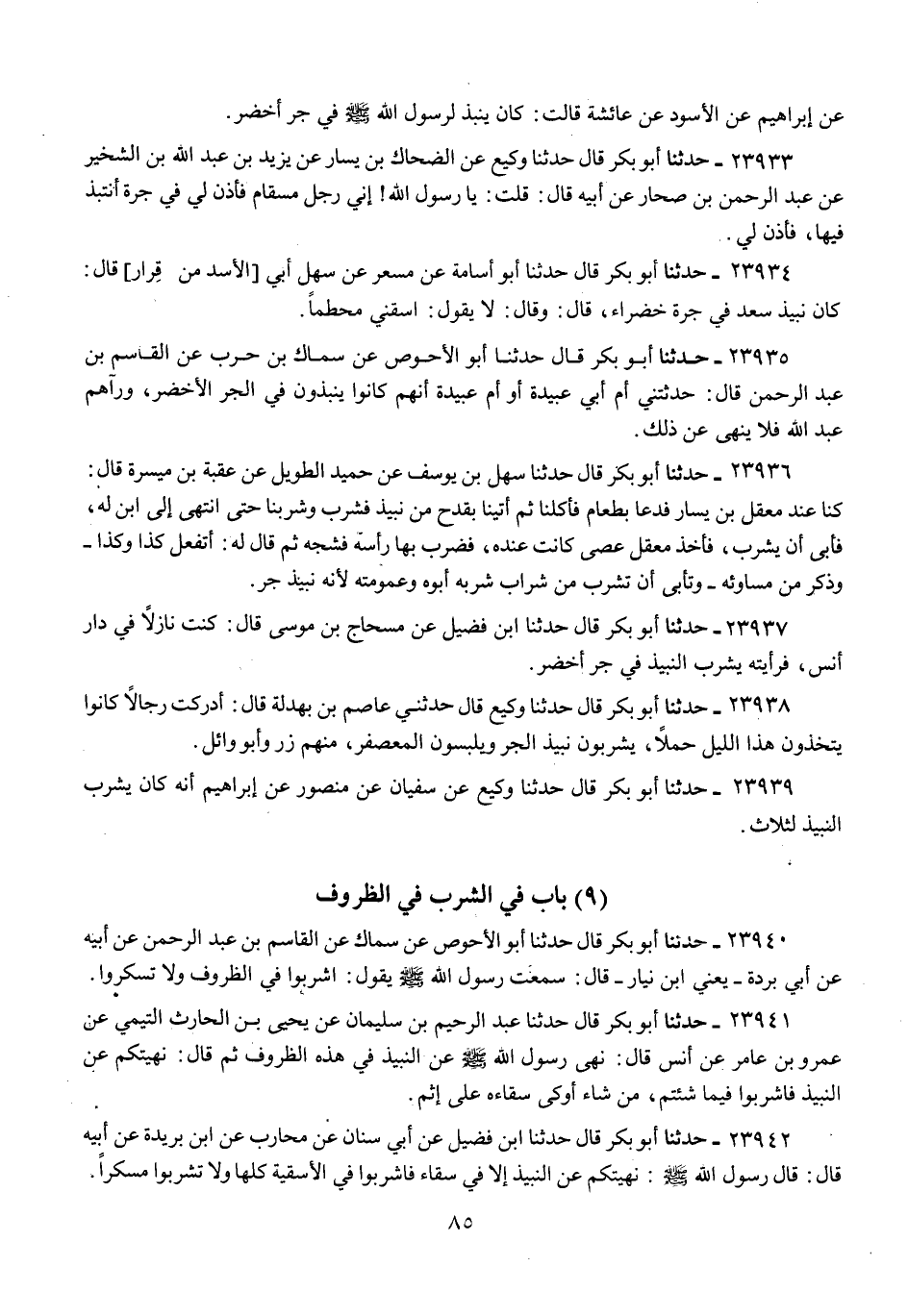 23937 - حَدَّثَنَا أَبُو بَكْرٍ قَالَ: حَدَّثَنَا ابْنُ فُضَيْلٍ، عَنْ مِسْحَاجِ بْنِ مُوسَى، قَالَ: كُنْتُ نَازِلًا فِي دَارِ أَنَسٍ، فَرَأَيْتُهُ «§يَشْرَبُ النَّبِيذَ فِي جَرٍّ أَخْضَرَ»