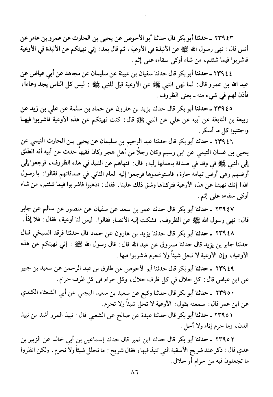23947 - حَدَّثَنَا أَبُو بَكْرٍ قَالَ: حَدَّثَنَا عُمَرُ بْنُ سَعْدٍ، عَنْ سُفْيَانَ، عَنْ مَنْصُورٍ، عَنْ سَالِمٍ، عَنْ جَابِرٍ، قَالَ: «§نَهَى رَسُولُ اللَّهِ صَلَّى اللهُ عَلَيْهِ وَسَلَّمَ عَنِ الظُّرُوفِ»، فَشَكَتْ إِلَيْهِ الْأَنْصَارُ فَقَالُوا: لَيْسَ لَنَا أَوْعِيَةٌ، فَقَالَ: «فَلَا إِذًا»