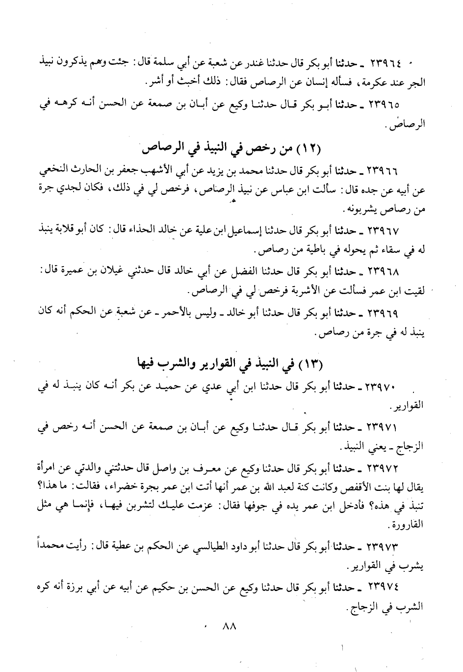 23966 - حَدَّثَنَا أَبُو بَكْرٍ قَالَ: حَدَّثَنَا مُحَمَّدُ بْنُ يَزِيدَ، عَنْ أَبِي الْأَشْهَبِ جَعْفَرِ بْنِ الْحَارِثِ النَّخَعِيِّ، عَنْ أَبِيهِ، عَنْ جَدِّهِ، قَالَ: «سَأَلْتُ ابْنَ عَبَّاسٍ عَنْ §نَبِيذِ الرَّصَاصِ، فَرَخَّصَ لِي فِي ذَلِكَ، فَكَانَ لِجَدِّي جَرَّةٌ مِنْ رَصَاصٍ يَشْرَبُونَهُ»