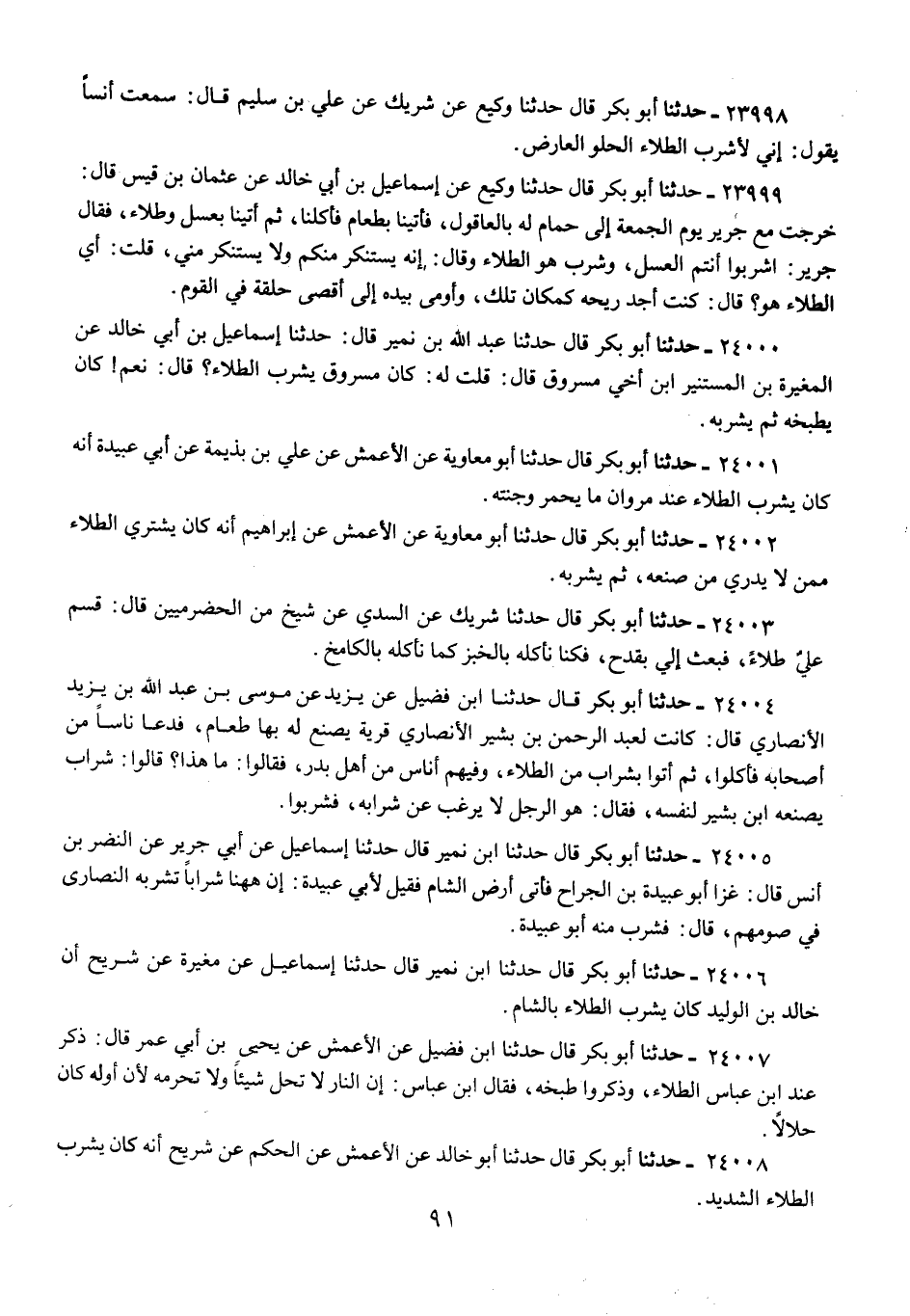 24000 - حَدَّثَنَا أَبُو بَكْرٍ قَالَ: حَدَّثَنَا عَبْدُ اللَّهِ بْنُ نُمَيْرٍ، قَالَ: حَدَّثَنَا إِسْمَاعِيلُ بْنُ أَبِي خَالِدٍ، عَنِ الْمُغِيرَةِ بْنِ الْمُسْتَنِيرِ، ابْنِ أَخِي مَسْرُوقٍ قَالَ: قُلْتُ لَهُ: كَانَ مَسْرُوقٌ §يَشْرَبُ الطِّلَاءَ؟ قَالَ: «نَعَمْ، كَانَ يَطْبُخُهُ ثُمَّ يَشْرَبُهُ»