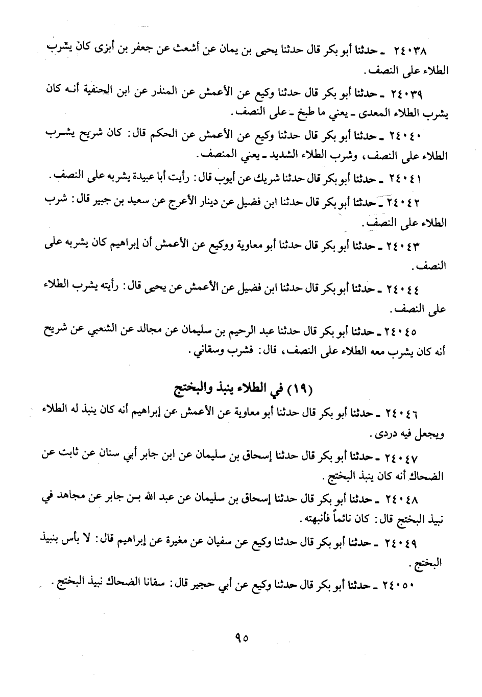 24043 - حَدَّثَنَا أَبُو بَكْرٍ قَالَ: حَدَّثَنَا أَبُو مُعَاوِيَةَ، وَوَكِيعٌ، عَنِ الْأَعْمَشِ، أَنَّ إِبْرَاهِيمَ «كَانَ §يَشْرَبُهُ عَلَى النِّصْفِ»