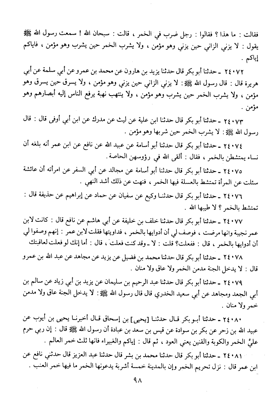 24073 - حَدَّثَنَا أَبُو بَكْرٍ قَالَ: حَدَّثَنَا ابْنُ عُلَيَّةَ، عَنْ لَيْثٍ، عَنْ مُدْرِكٍ، عَنِ ابْنِ أَبِي أَوْفَى، قَالَ: قَالَ رَسُولُ اللَّهِ صَلَّى اللهُ عَلَيْهِ وَسَلَّمَ: «§لَا يَشْرَبُ الْخَمْرَ حِينَ شُرْبِهَا وَهُوَ مُؤْمِنٌ»