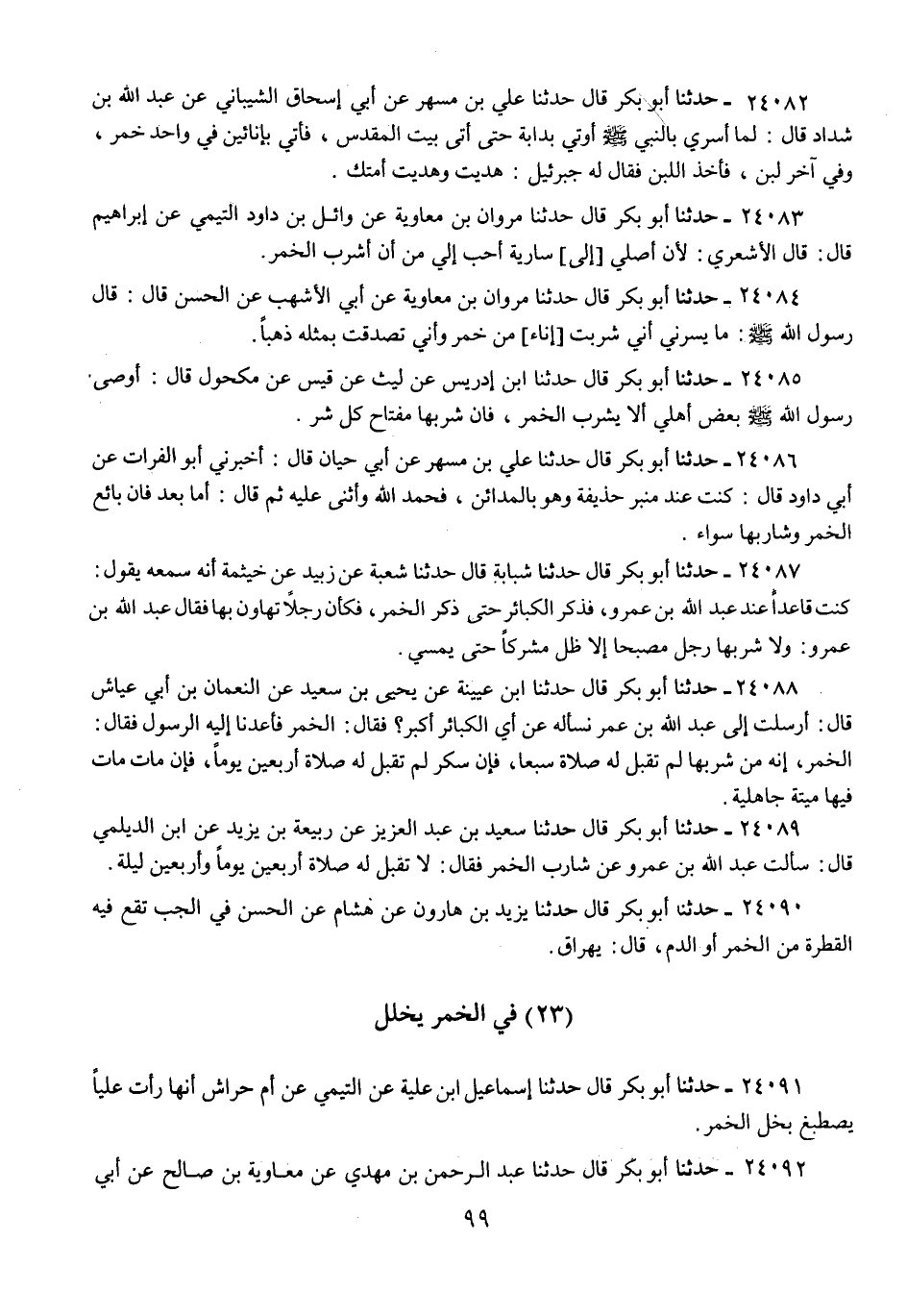 24089 - حَدَّثَنَا أَبُو بَكْرٍ قَالَ: حَدَّثَنَا سَعِيدُ بْنُ عَبْدِ الْعَزِيزِ، عَنْ رَبِيعَةَ بْنِ يَزِيدَ، عَنِ ابْنِ الدَّيْلَمِيِّ، قَالَ: سَأَلْتُ عَبْدَ اللَّهِ بْنَ عَمْرٍو عَنْ شَارِبِ الْخَمْرِ، فَقَالَ: «§لَا تُقْبَلُ لَهُ صَلَاةٌ أَرْبَعِينَ يَوْمًا وَأَرْبَعِينَ لَيْلَةً»